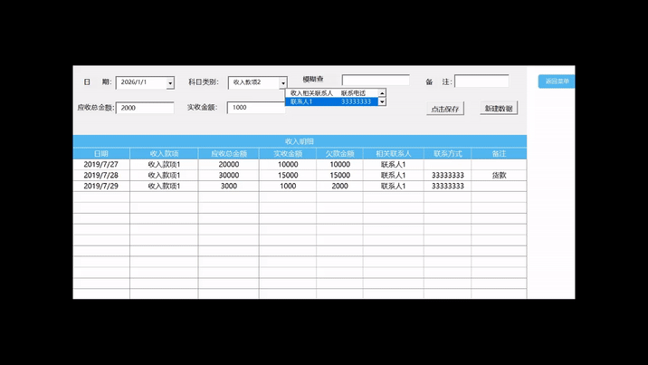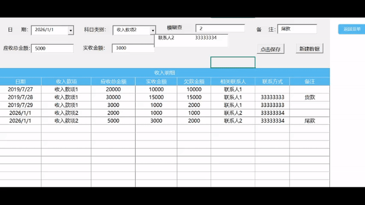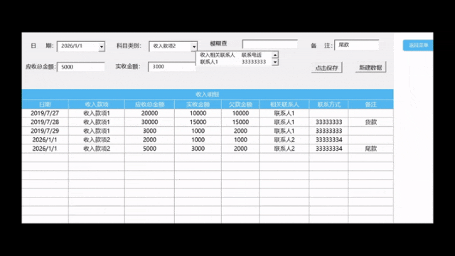 2. 在收支表中点击“新建数据”,即可在独立的窗口中完成信息录入。保存后,数据将自动归档并同步计算欠款。