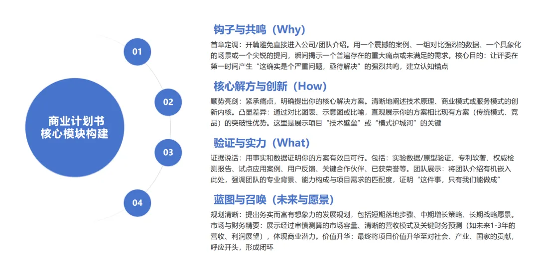 顺势亮剑: 紧承痛点,明确提出你的核心解决方案。清晰地阐述技术原理、商业模式或服务模式的创新内核。