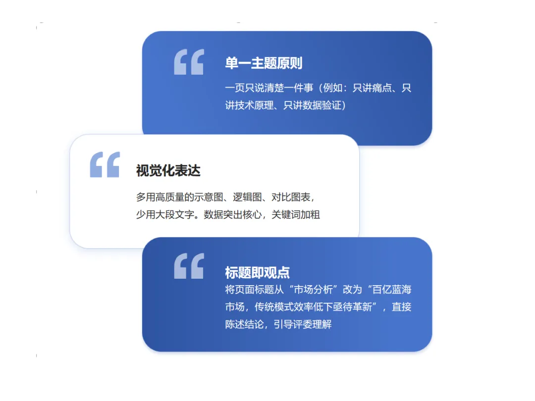 在宏观故事线下,每一页PPT都是一个微观叙事单元。单一主题: 一页只说清楚一件事(例如:只讲痛点、只讲技术原理、只讲数据验证)。