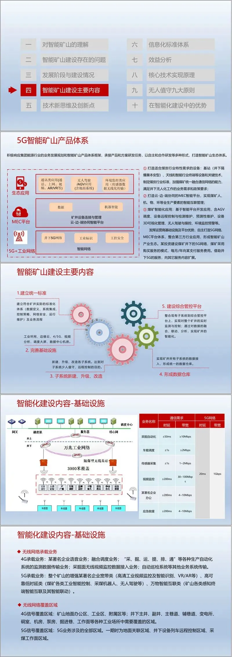 - 完善基础设施:部署工业环网、边缘云、4G/5G网络,并建设数据中心机房。4G主要承载语音、调度及部分监测数据,而5G则支撑高清视频、VR/AR、智能控制、无人驾驶等高带宽、低时延业务。