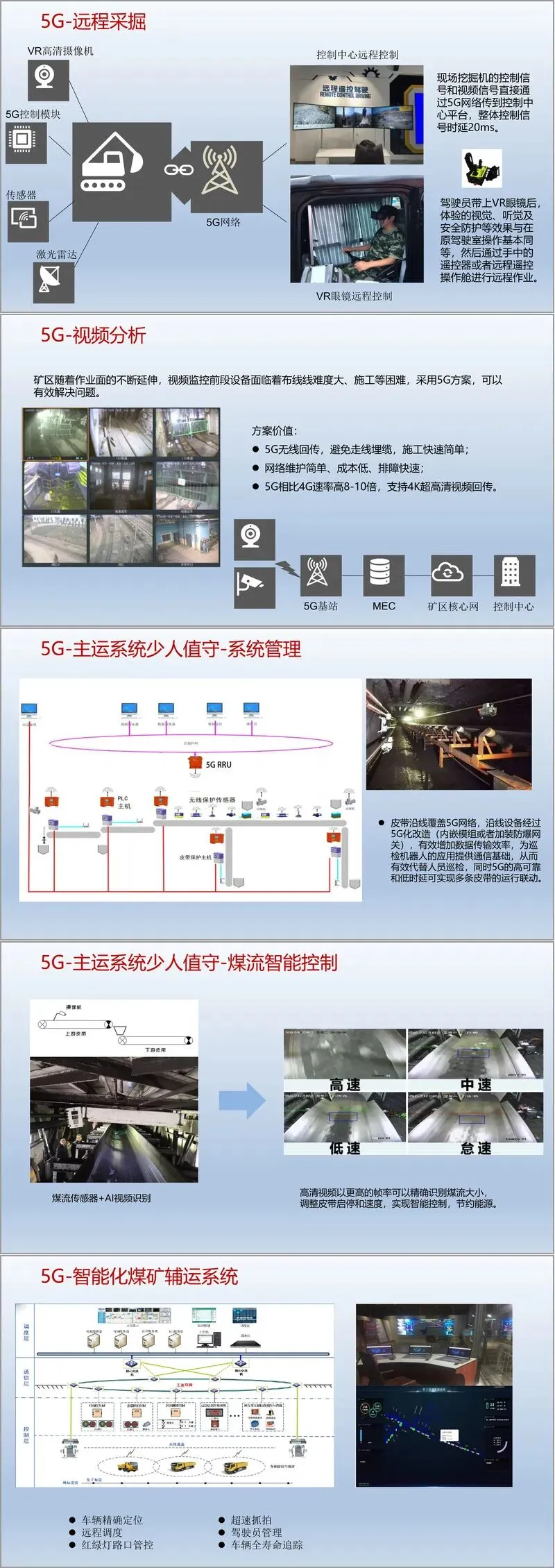 具体应用场景包括:5G远程采掘(控制时延低至20ms)、5G视频无线回传、主运系统少人值守(通过AI视频识别实现煤流智能控制)、智能化辅运系统(车辆精确定位与调度)、以及智能穿戴设备应用等。