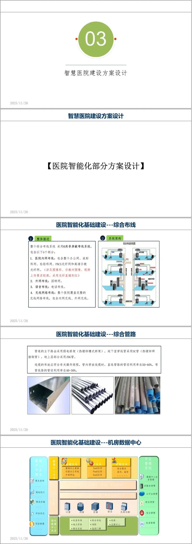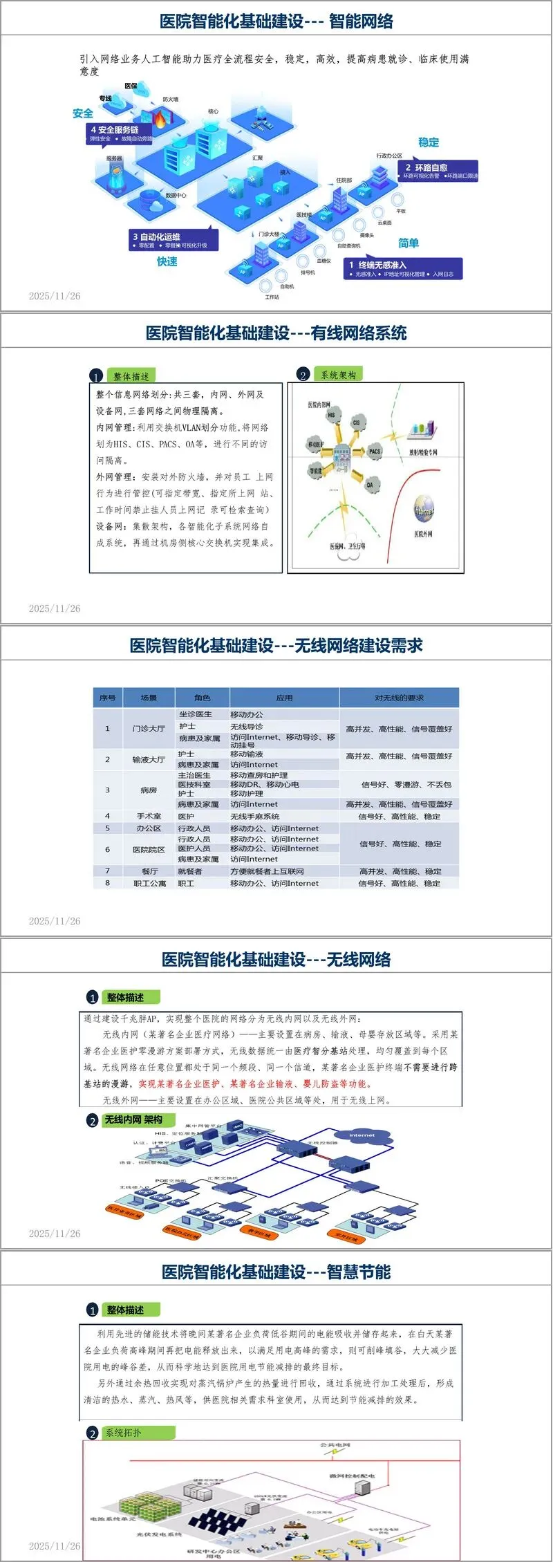 方案在智能化基础建设方面提出详尽设计。综合布线系统采用六类非屏蔽标准,分设内网、外网、语音及无线网络四部分,满足医疗业务高带宽、高可靠性需求。网络架构划分为内网、外网与设备网,物理隔离确保安全,并利用VLAN技术实现业务隔离。无线网络建设尤为突出,针对门诊、病房、手术室等不同场景,设计千兆胖AP部署,采用医护零漫游方案,确保移动医疗业务不丢包、不间断。机房与数据中心作为医院数字心脏,其设计严格遵循电子信息系统机房规范,保障业务连续性。