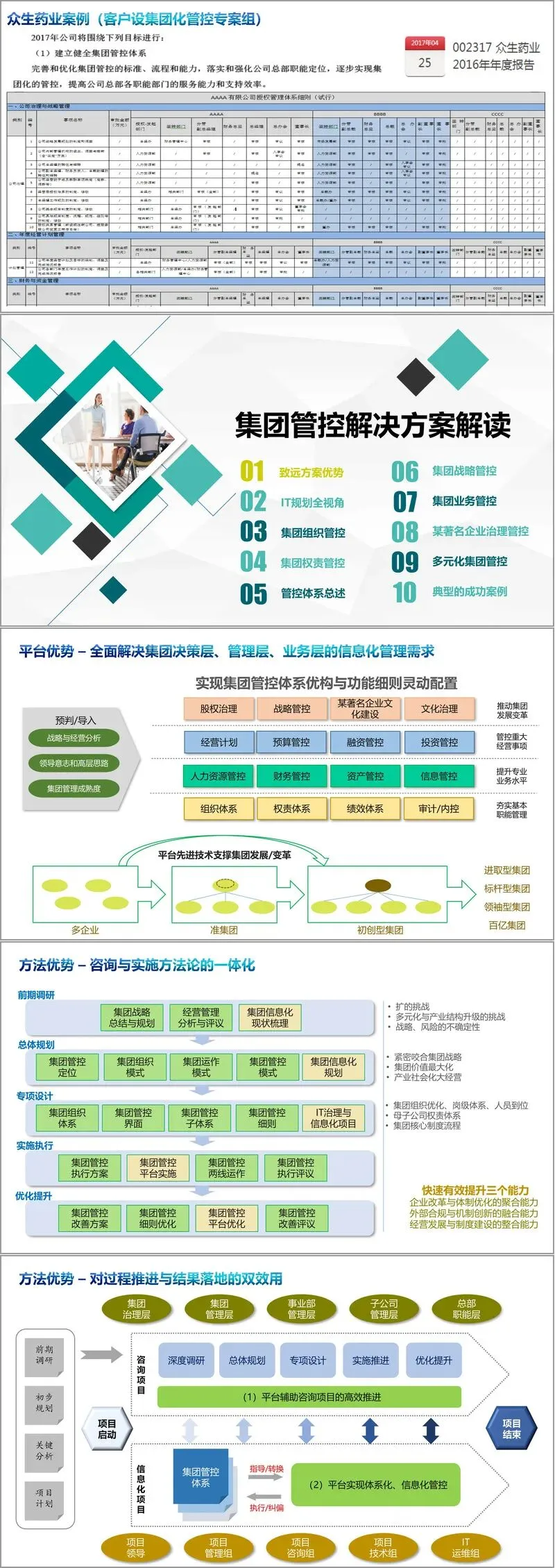 文档通过国商控股、众生药业、中美集团、上汽集团投资公司、特驱集团、郎酒集团等多个真实案例,展示了解决方案在不同行业、不同管控重点下的成功应用。这些案例涉及初创型集团管控体系构建、集团化管控专案组设立、财务活动精准管控、投资项目全过程管理、事业部人力资源管控、销售公司编制与合同管理等具体场景,验证了方案的有效性和适应性。