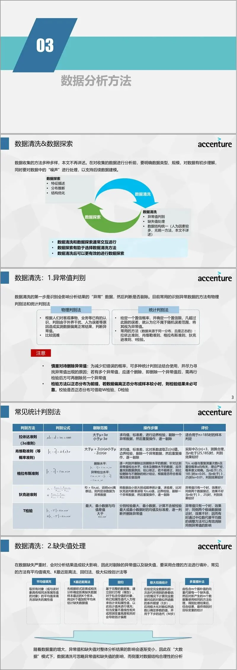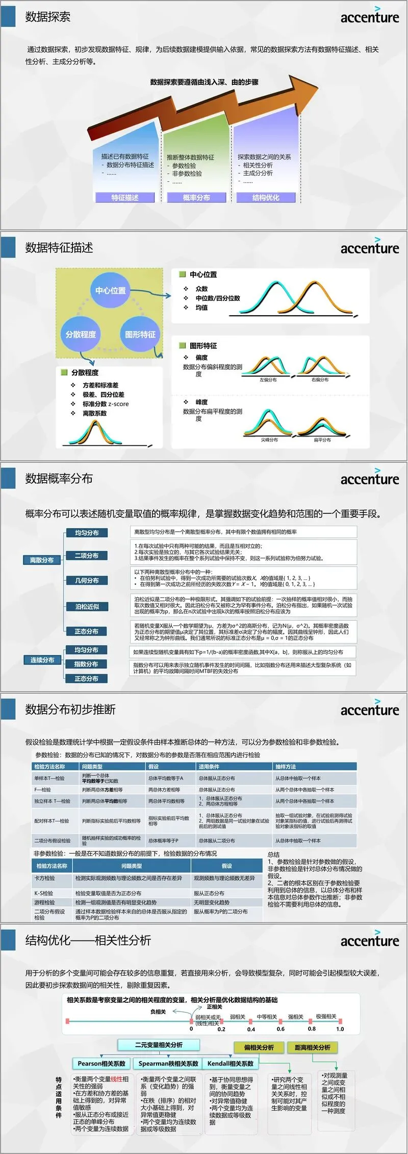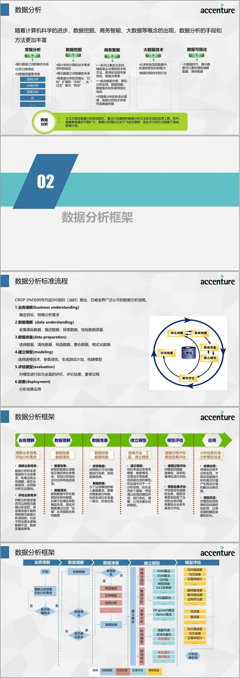 在数据分析流程方面,埃森哲采用了业界广泛认可的CRISP-DM标准框架,包括六个阶段:业务理解、数据理解、数据准备、建立模型、模型评估与部署。这一流程从明确业务目标开始,通过数据收集、清洗与探索,逐步构建并验证模型,最终将分析结果应用于实际业务场景中,形成一个闭环的数据治理体系。