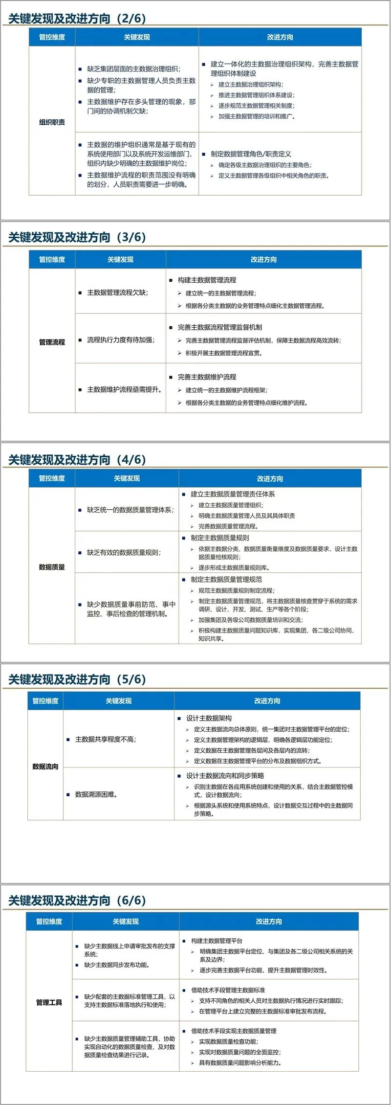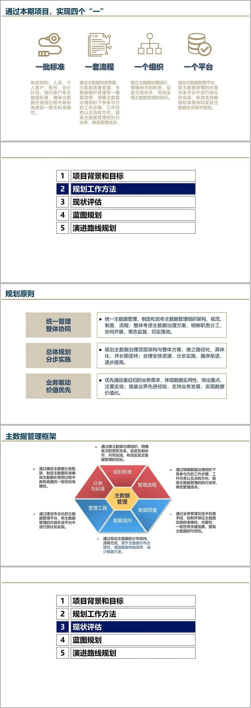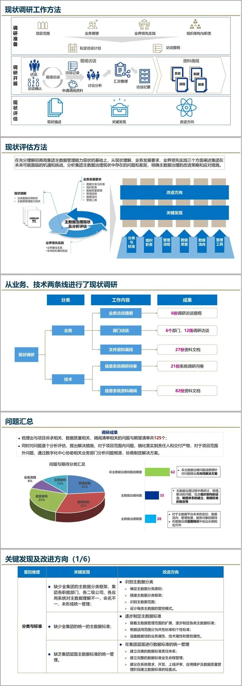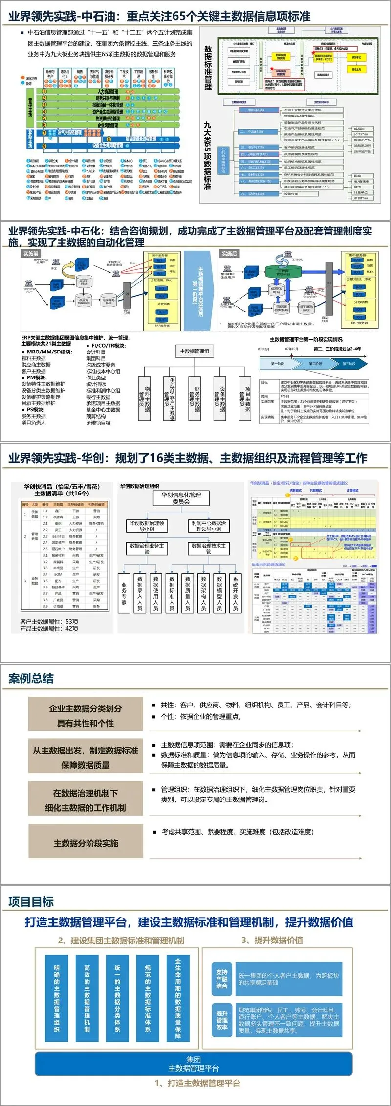 规划方法上,方案强调“业务驱动、价值优先、统一管理、分步实施”的原则。通过现状调研,从业务与技术两条线入手,深入分析主数据在分类、标准、组织、流程、质量、流向和管理工具七个方面的现状与问题,并借鉴中石油、中石化、华创等行业领先实践,提出具有针对性的改进策略。