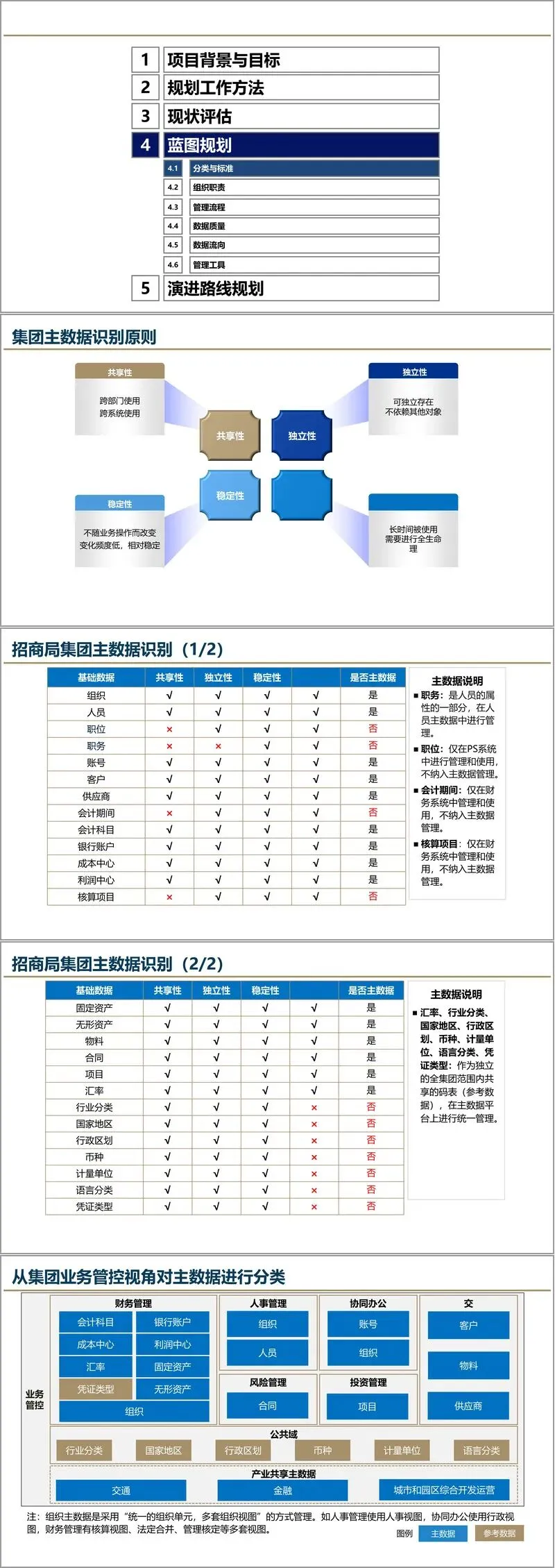 该方案首先明确了主数据的定义与分类。主数据被界定为在企业多个系统中被重复使用、具有统一标识的核心业务对象数据,如客户、供应商、物料、组织、会计科目等。与之相对应的是交易数据和指标数据,三者共同构成企业的“数据之树”。主数据因其稳定性、共享性和跨系统流通性,成为数据治理的首选切入点。