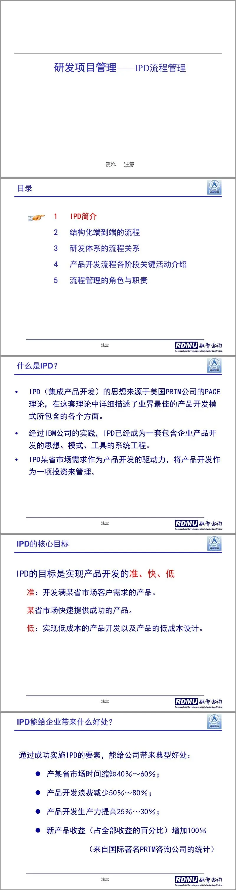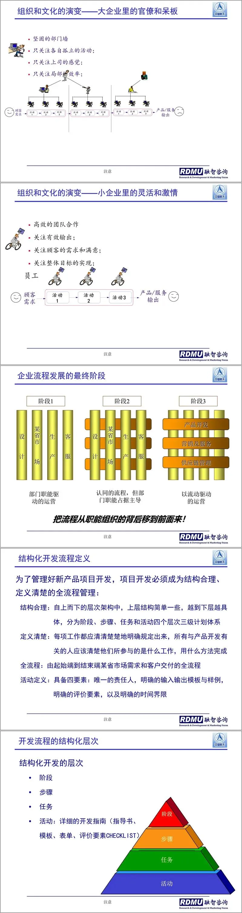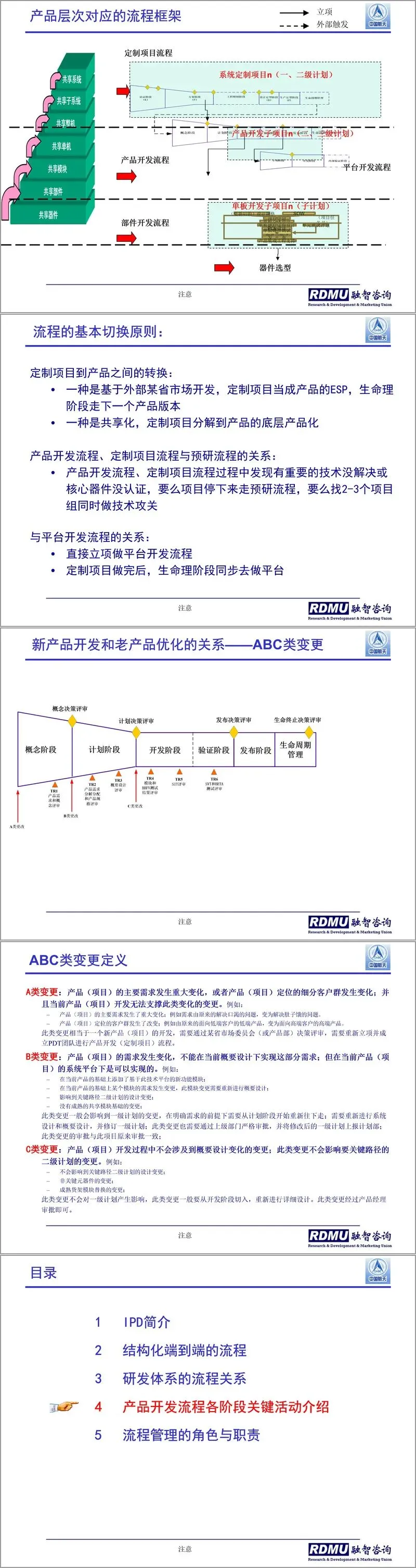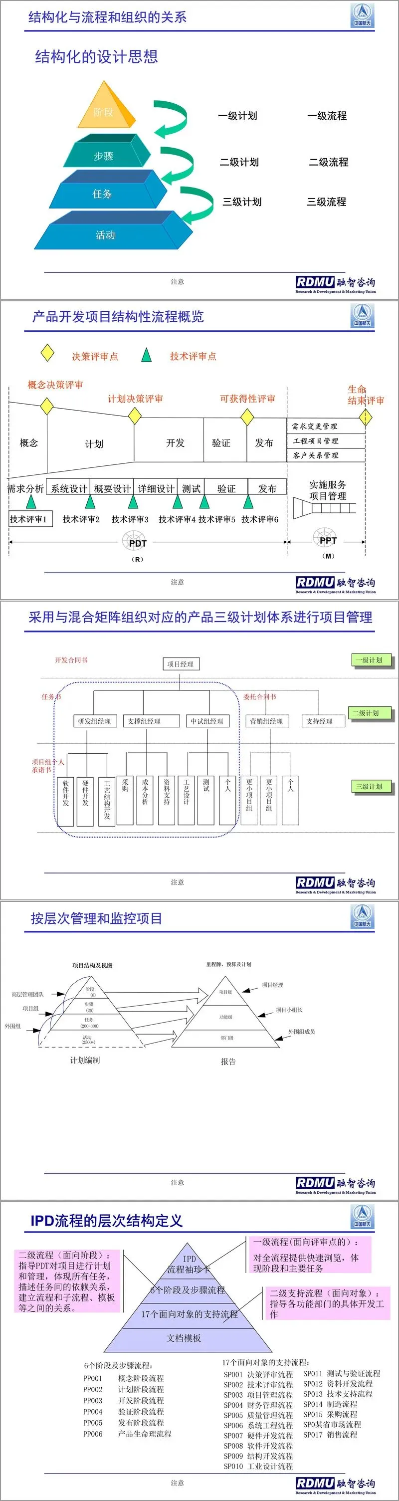 流程与制度相辅相成,制度规范行为,保证“做正确的事”;流程整合活动,确保“正确地做事”。IPD流程体系通过结构化设计、角色职责明确、评审机制健全和变更管理规范,为企业提供了一套科学、系统的新产品开发管理模式,助力企业在激烈的市场竞争中持续提升产品开发能力和核心竞争力。