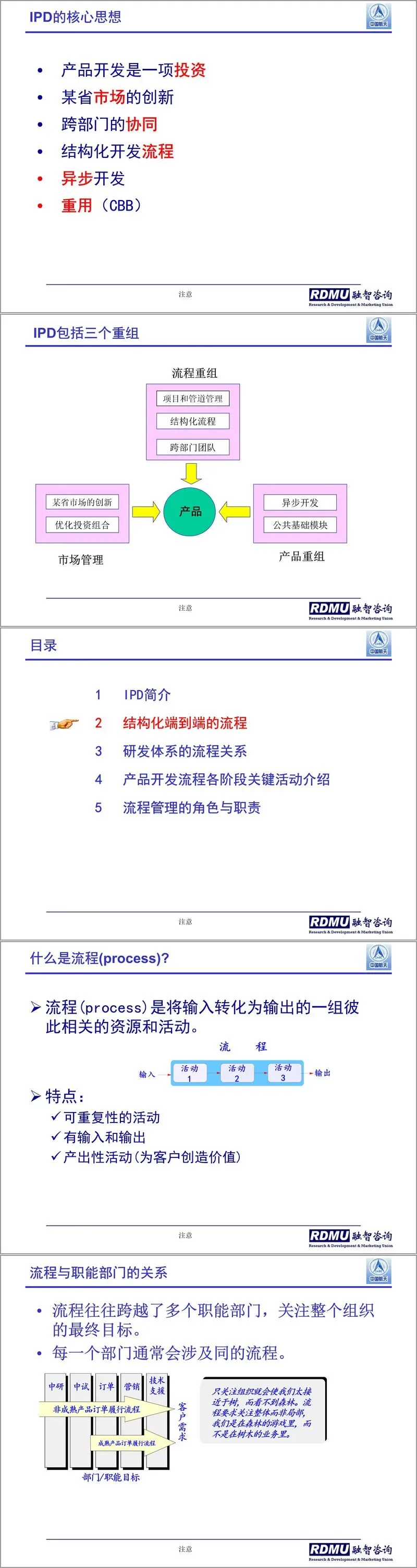 IPD的核心思想涵盖多个层面:首先,它将产品开发定位于投资行为,注重投资回报;其次,强调基于市场的创新,确保产品符合实际市场需求;第三,倡导跨部门协同,打破职能壁垒;第四,建立结构化的开发流程,实现端到端的全过程管理;第五,推行异步开发模式,提升开发效率;最后,重视共用基础模块(CBB)的重用,减少重复开发,降低成本和风险。