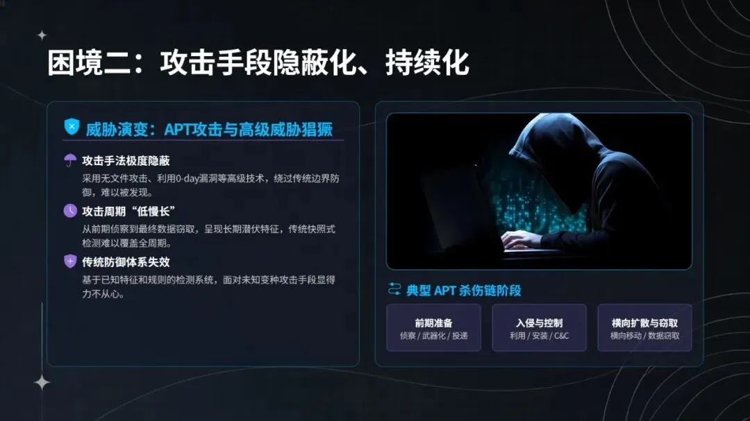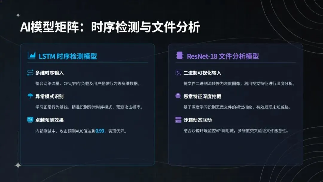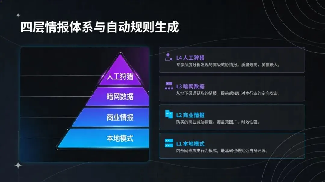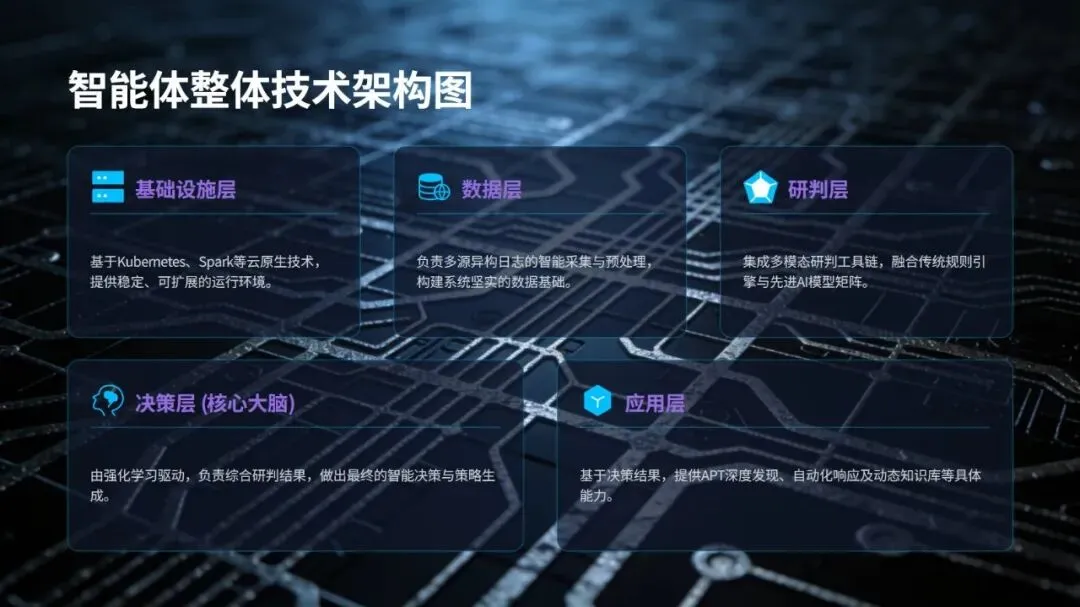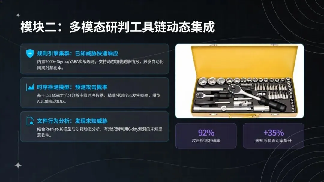 智能体的核心优势源于五大技术架构的协同支撑:在日志采集环节,支持 20 余种协议,覆盖防火墙、IDS、终端等各类设备,借助 Apache Pulsar 实现 TB 级日志秒级接入,日志覆盖率达 99%,处理延迟控制在 1 秒以内,还能结合威胁情报完成 ATT&CK 标签标注与资产优先级划分;研判工具链方面,整合 2000 余条 Sigma/YARA 动态规则,搭配 LSTM 时序检测模型(攻击预测 AUC 达 0.93)与 ResNet-18 + 沙箱的文件行为分析方案,使攻击检测准确率提升至 92%,未知威胁识别能力增强 35%;决策核心采用强化学习技术,通过 6 阶段攻击链建模与 DQN+GRU 网络,构建 9 维自动化响应动作空间,将误报率从 8% 降至 1.2%,攻击链阻断成功率达 88%;APT 攻击发现模块运用 FastDTW 算法、图神经网络分析及对抗防御优化,把威胁发现时间从 72 小时压缩至 4.5 小时;动态知识库则通过本地模式、商业情报、暗网数据、人工狩猎四层体系,结合 NLP 大模型自动生成检测规则与双循环优化机制,威胁情报匹配准确率达 82%,规则更新效率提升 60%。