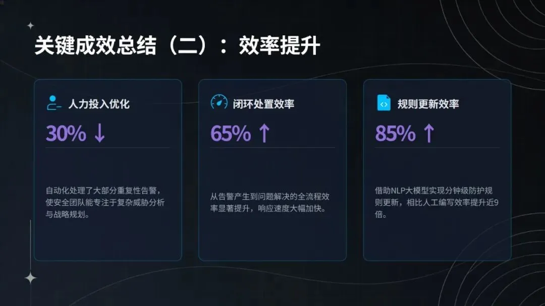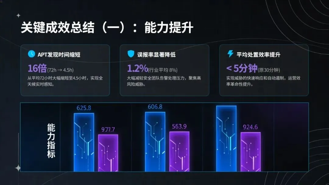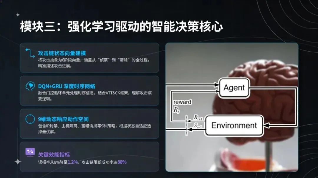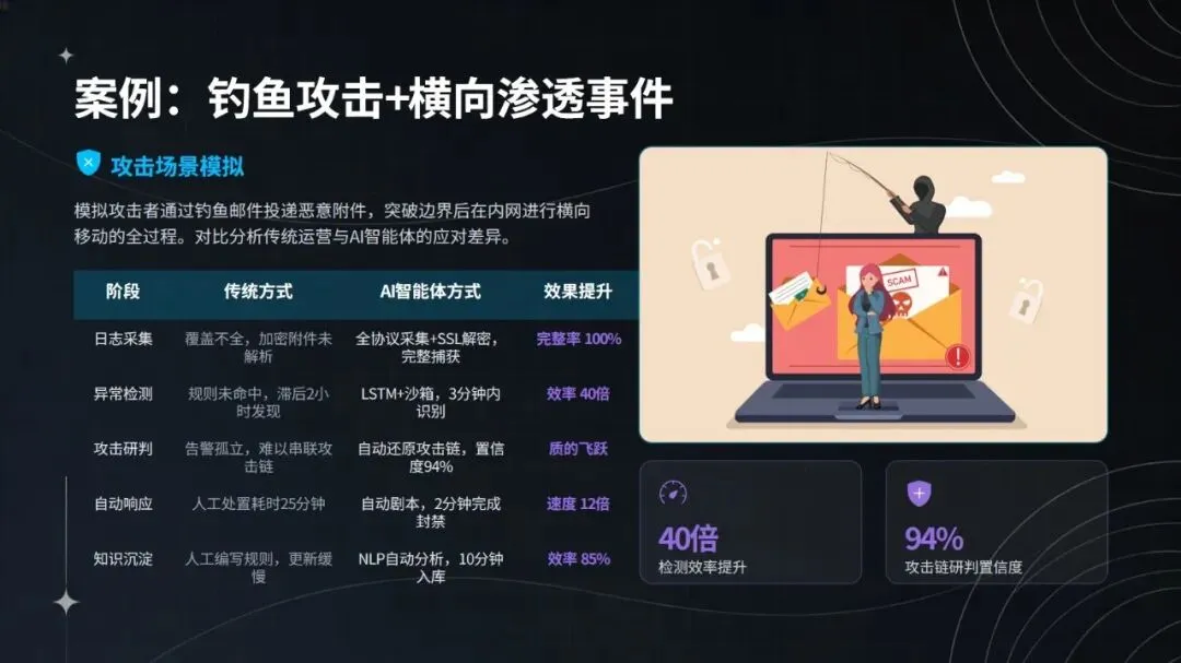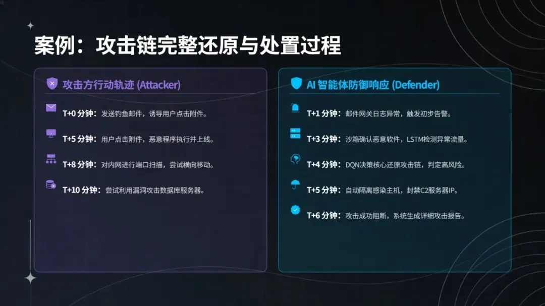 在钓鱼攻击与横向渗透事件的实战处置中,该智能体表现亮眼:日志采集实现全协议覆盖与 SSL 解密,完整率达 100%;3 分钟即可识别异常,检测效率较传统方式提升 40 倍;能通过 DQN 网络还原攻击链,关联 6 台设备,研判置信度达 94%;2 分钟内完成隔离、封禁等自动化处置,响应速度加快 12 倍;规则自动生成并入库仅需 10 分钟,更新效率提升 85%。