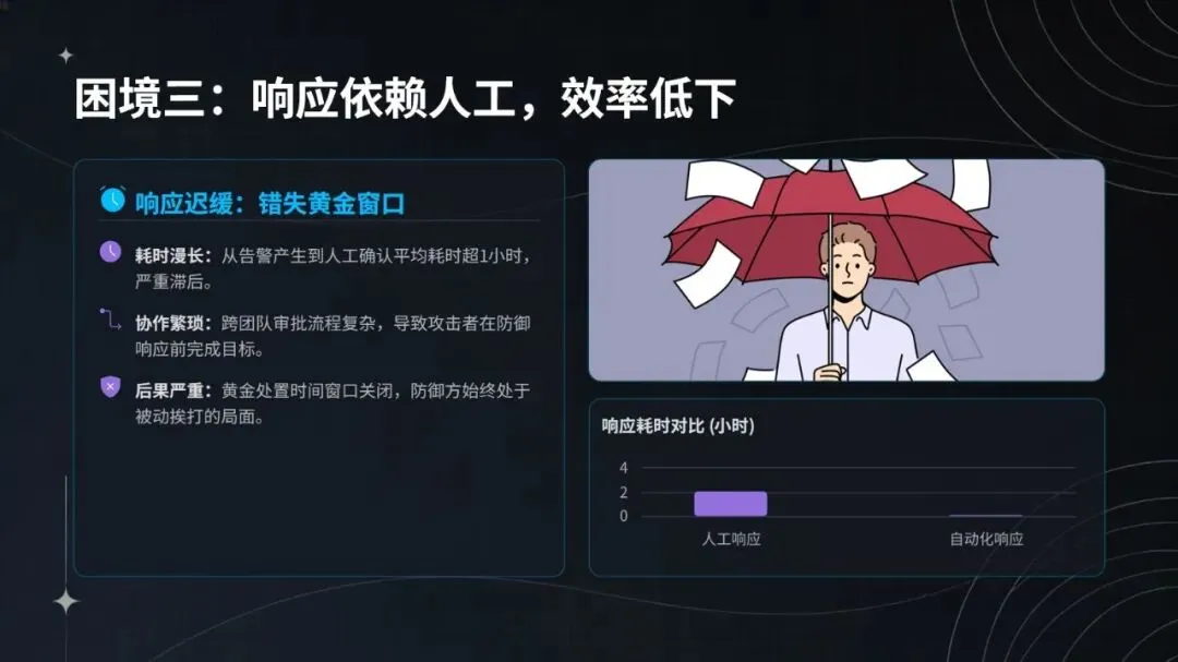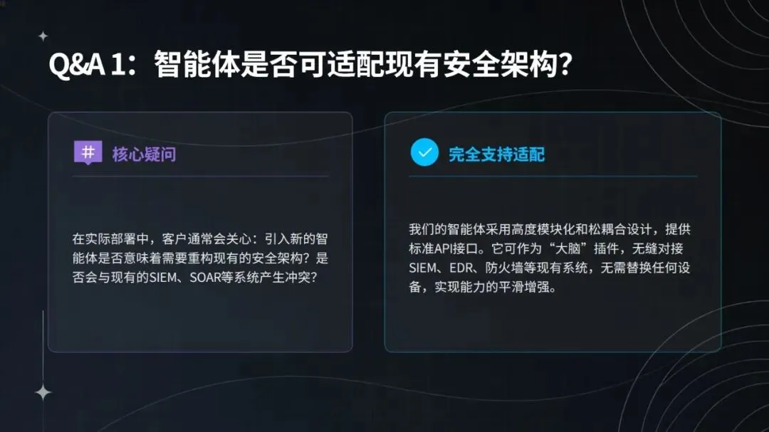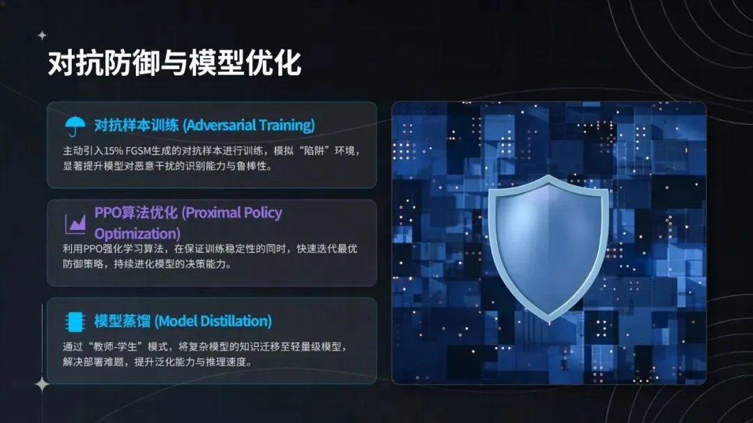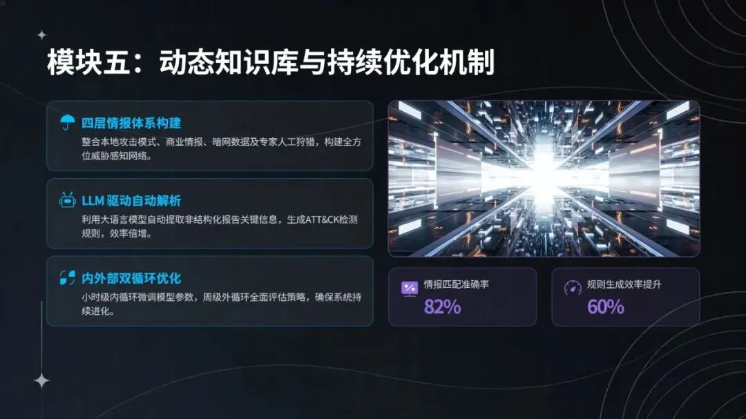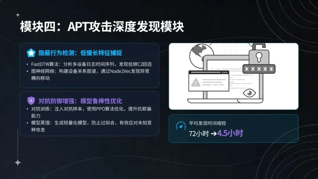 在钓鱼攻击与横向渗透事件的实战处置中,该智能体表现亮眼:日志采集实现全协议覆盖与 SSL 解密,完整率达 100%;3 分钟即可识别异常,检测效率较传统方式提升 40 倍;能通过 DQN 网络还原攻击链,关联 6 台设备,研判置信度达 94%;2 分钟内完成隔离、封禁等自动化处置,响应速度加快 12 倍;规则自动生成并入库仅需 10 分钟,更新效率提升 85%。