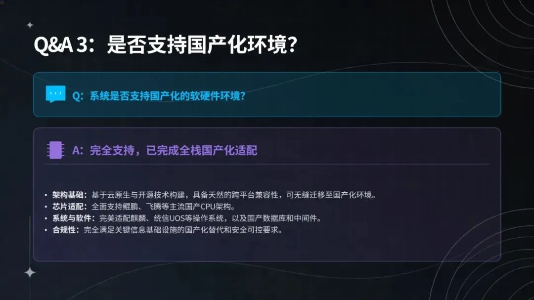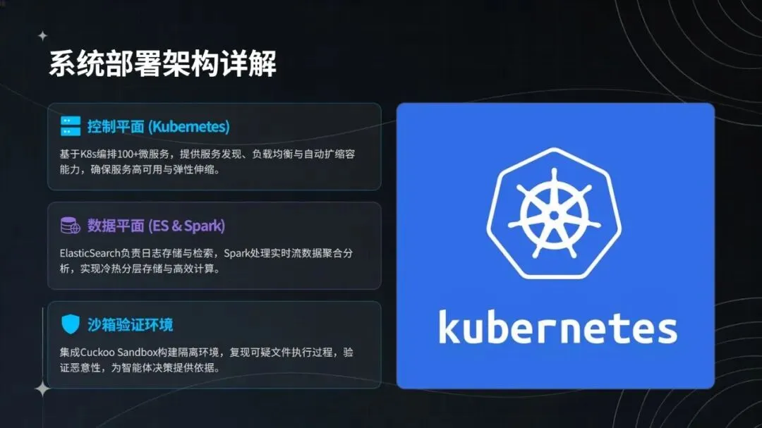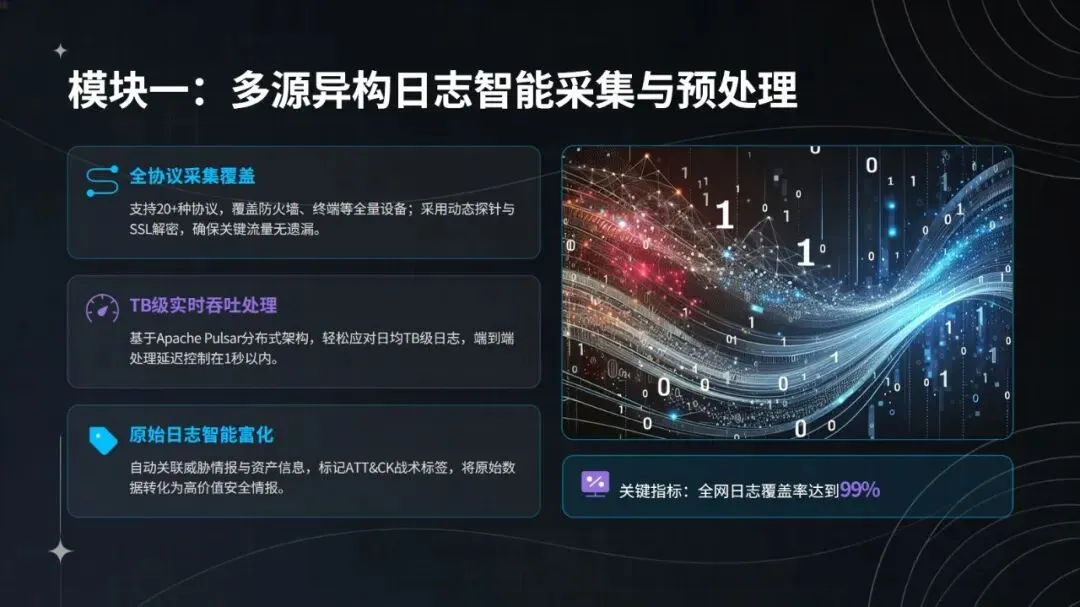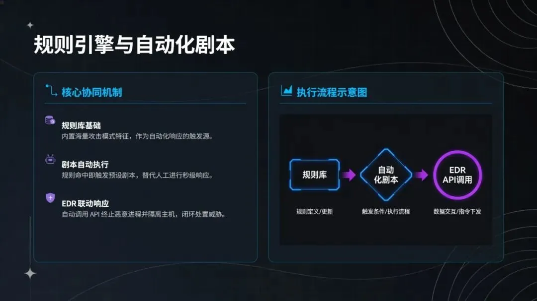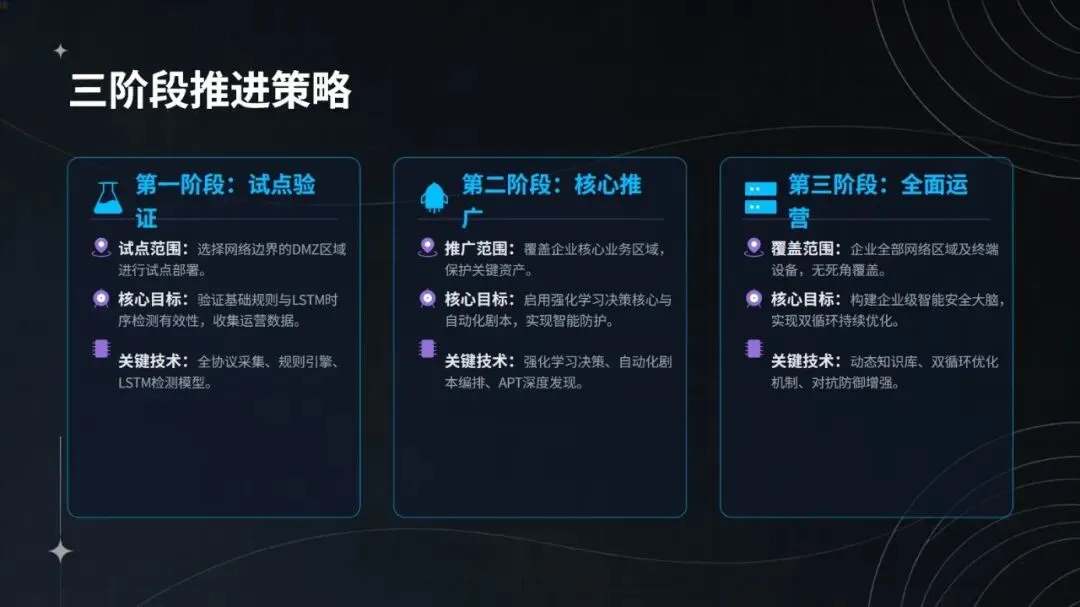 部署方面,系统采用三阶段推进策略,先在 DMZ 区域试点验证基础检测与采集能力,再向核心业务推广智能决策与响应功能,最终实现全集团覆盖与持续优化。其架构支持模块化对接现有安全系统(如 SIEM、SOAR、EDR),适配国产化芯片、操作系统与数据库,实际应用中已实现人力投入减少 30%、闭环处置效率提升 65%,平均处置时间从 30 分钟缩短至 5 分钟以内。