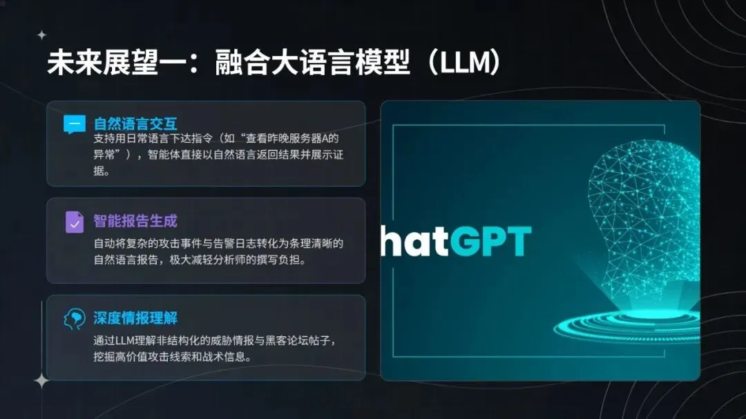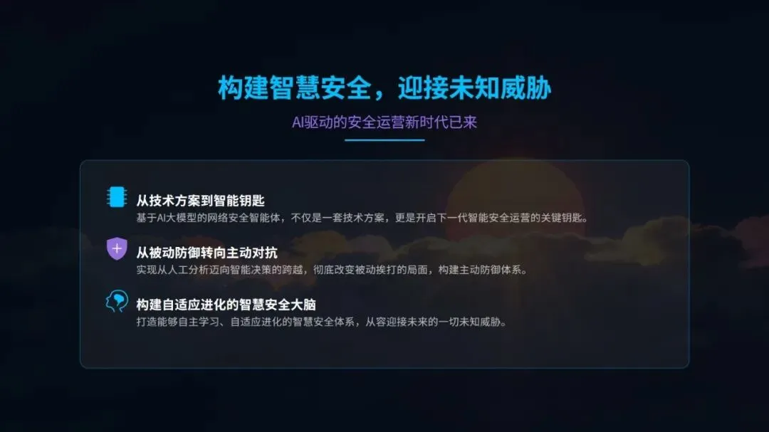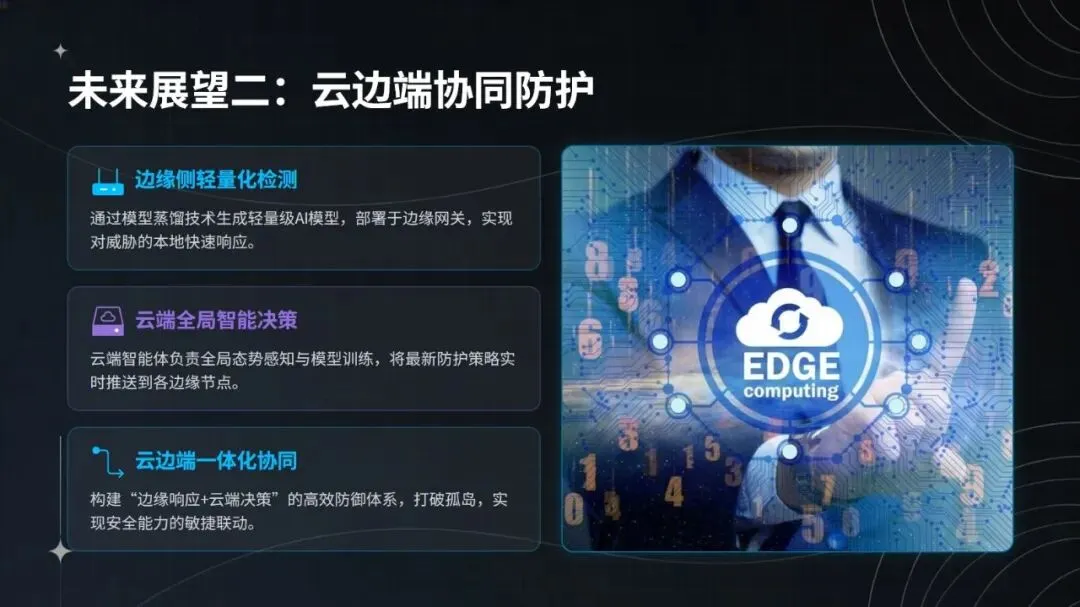 未来,智能体将进一步深度融合大语言模型,实现自然语言化的研判交互;拓展边缘侧轻量化检测能力,构建云边端协同防护体系;同时推动行业共享情报网络建设,通过协同防御模式,为网络安全防护注入更强大的智能动力,开启 AI 驱动的安全运营新阶段。