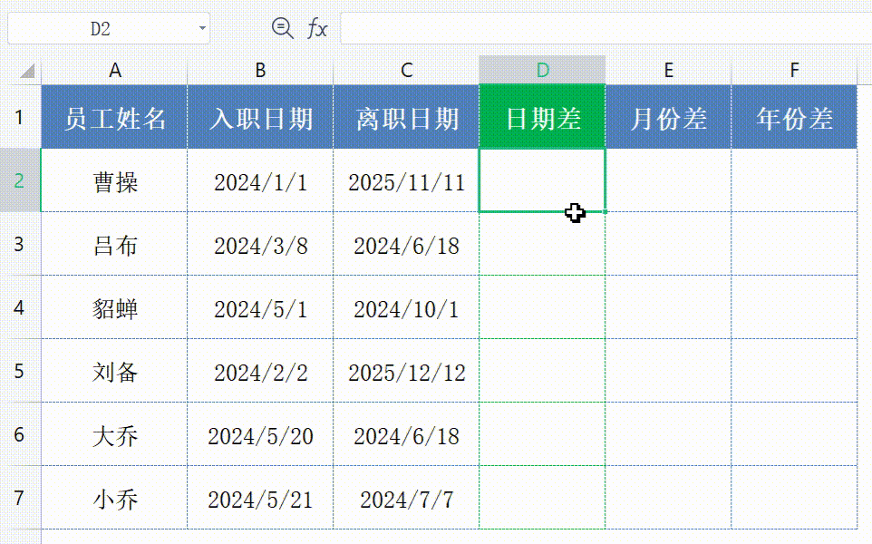 Excel便会计算出两个日期之间的年份差。同样地,DATEDIF函数也支持根据需求返回天数差。只需将第三个参数改为“D”,即可在目标单元格中输入公式