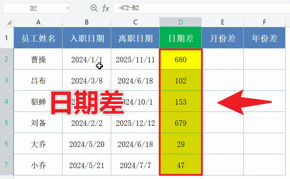 表姐整理了552页《Office从入门到精通》,关注后私信【教程】即可领取!↑↑↑一、计算日期天数差:直接相减,简单快捷