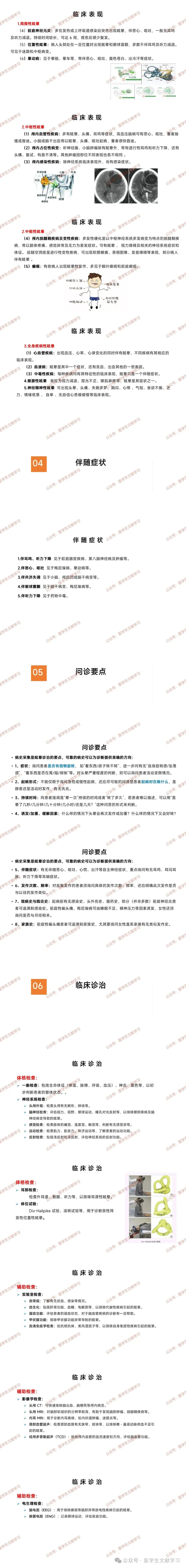 耳部检查:检查外耳道、鼓膜、听力等,排除耳源性眩晕;进行体位试验,如 Dix - Hallpike 试验、滚转试验等,用于诊断良性阵发性位置性眩晕。