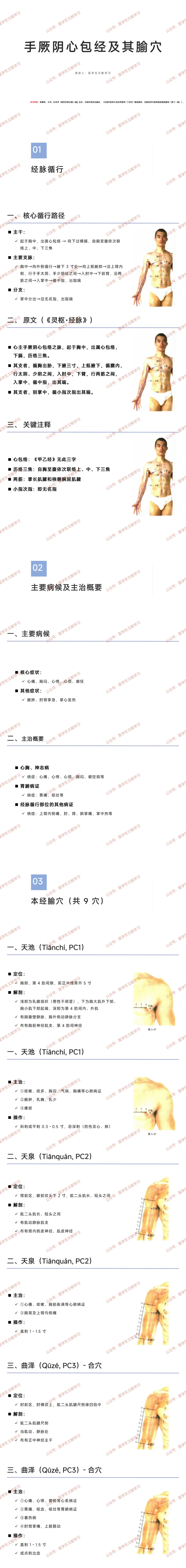 手厥阴心包经(简称心包经)是十二经脉之一,核心关联心包与三焦,腧穴以治疗心胸、神志、胃腑及经脉循行部位病证为主,掌握其循行与腧穴特性是针灸临床应用的基础。