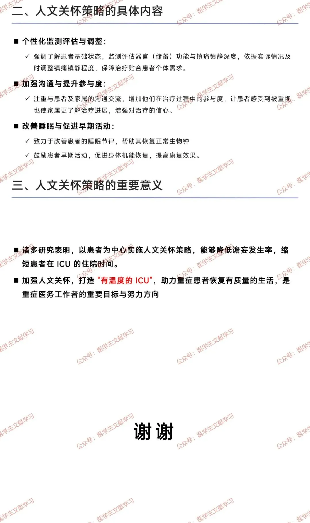 多项研究表明,以患者为中心实施人文关怀,可降低谵妄发生率,缩短患者 ICU 住院时间。加强人文关怀,打造 “有温度的 ICU”,帮助重症患者恢复有质量的生活,是重症医务工作者的重要目标与努力方向。