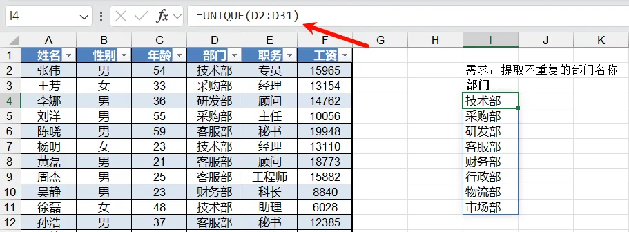 需求:从“部门”列提取所有不重复部门名称(如“销售部、技术部、人事部”)。