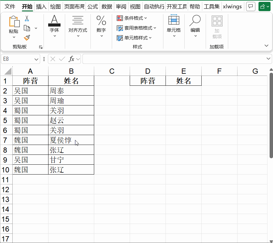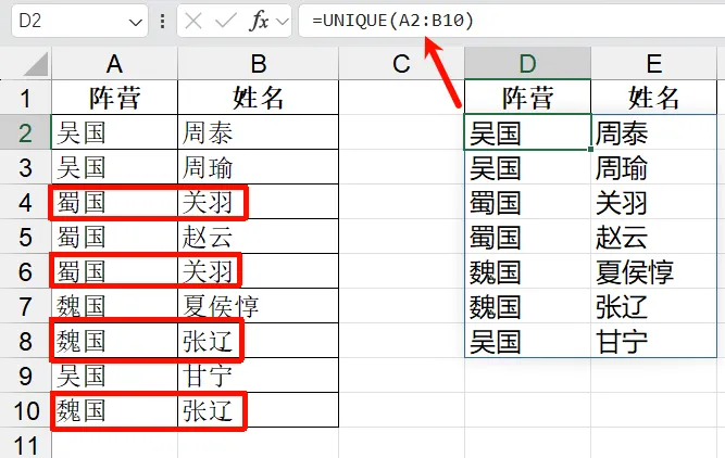 需求:从“阵营+姓名”组合中提取唯一记录