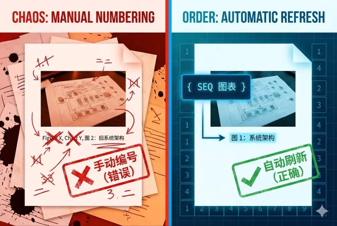 写标书或论文时,最痛苦的莫过于“图 1、图 2、图 3……”的手动编号。一旦老板让你在“图 2”前面加一张新图,后面几百张图的编号全部要顺延。