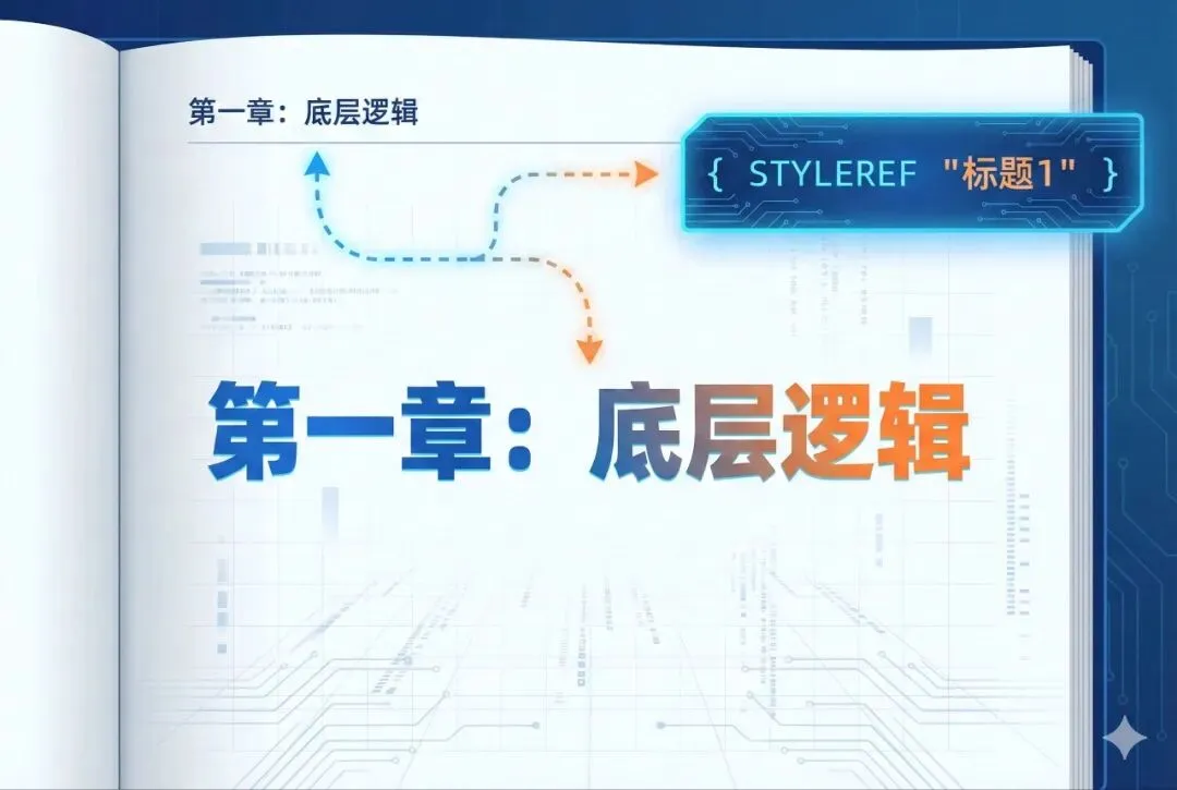 这句话的意思是:“Word 你听好了,去正文里帮我找最近的一个‘标题 1’样式,把它的文字抓取过来,放到页眉这里。”