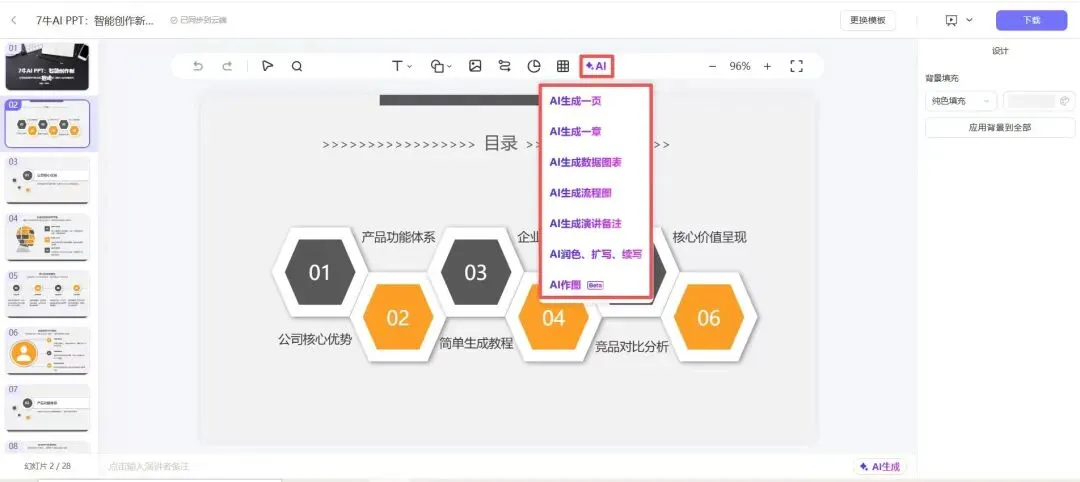 通过 “AI生成演讲备注”,生成口语化表达,方便您进行汇报演讲。