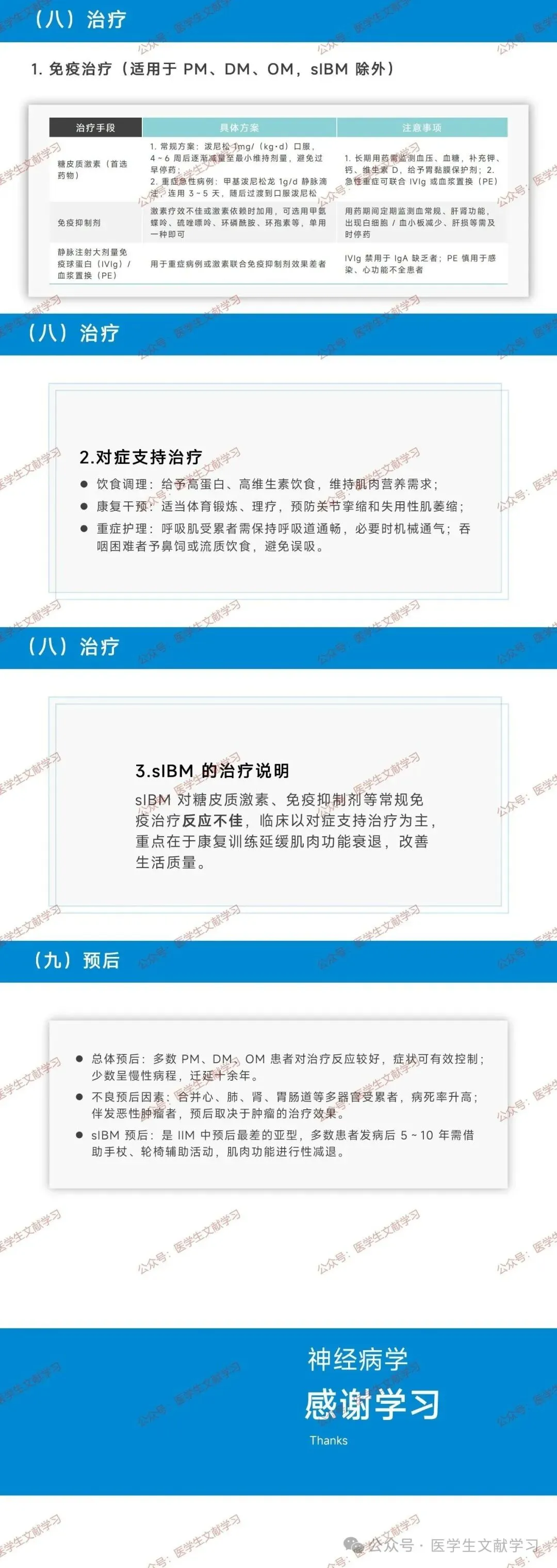 - 核心:免疫抑制治疗为主,对症支持治疗为辅;sIBM 以对症支持为主。