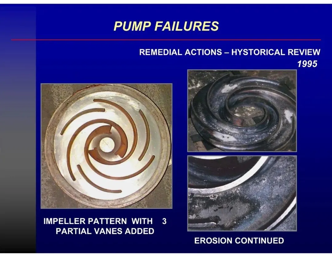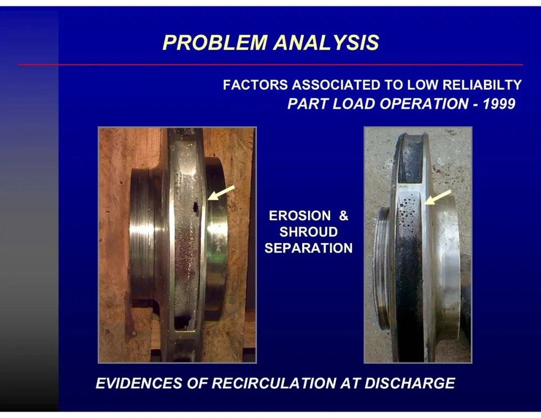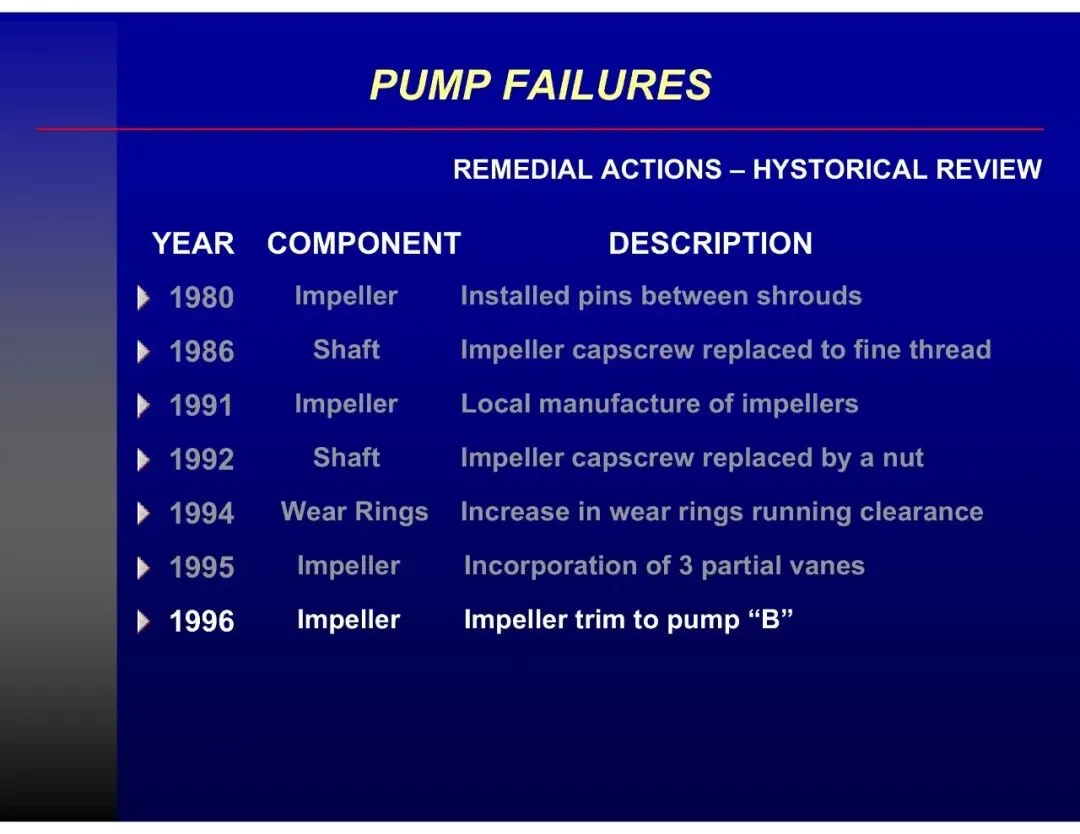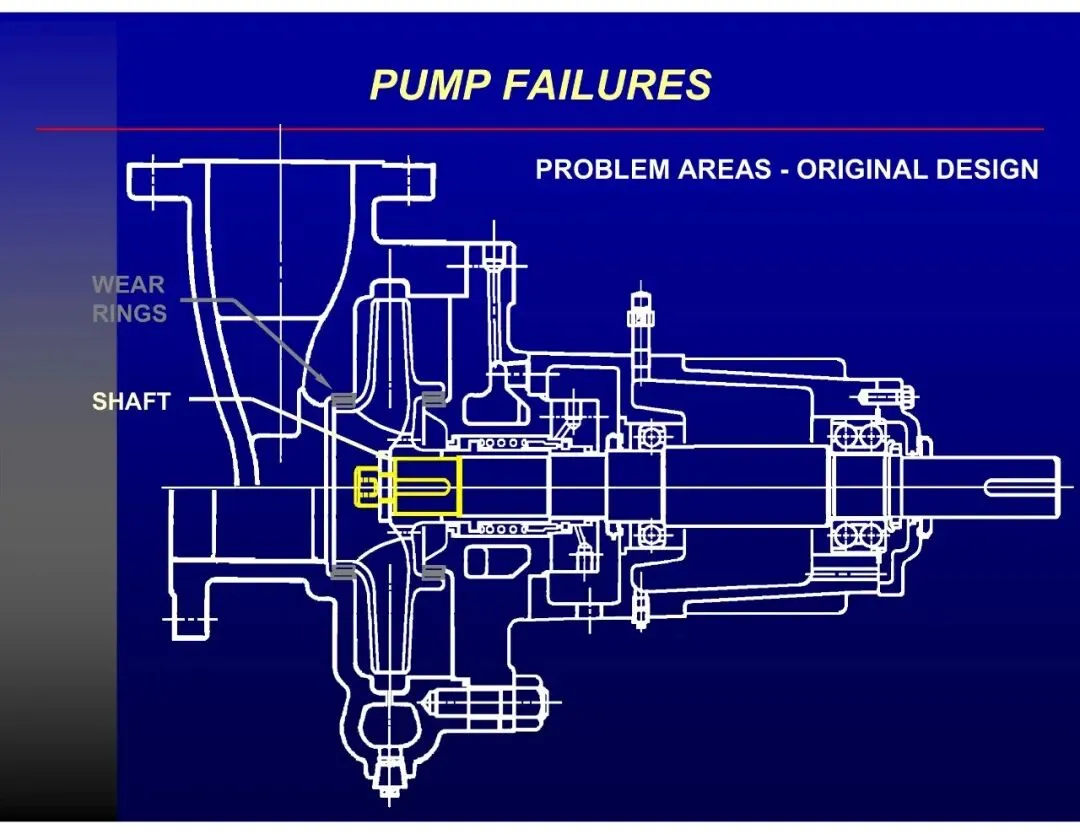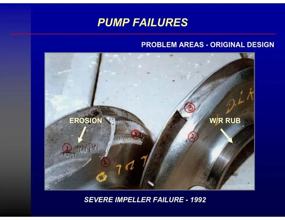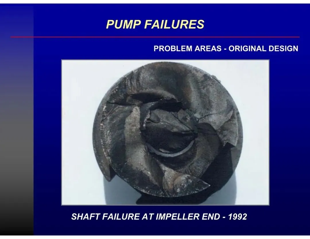 该厂有两台290 kW(390 HP)的泵,由汽轮机或电机驱动,额定流量为262 m³/h(1,153 gpm),扬程为271 m(889 ft)。由于NPSHA偏低且长期处于部分负荷运行状态,这些泵工作在极为苛刻的工况下。设备运行不稳定,振动剧烈,并因以下问题频繁维修:轴反复发生疲劳断裂、口环严重摩擦、叶轮腐蚀/冲蚀、机械密封泄漏以及轴承损坏。