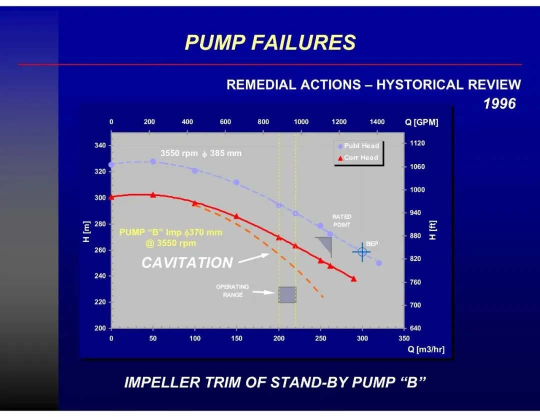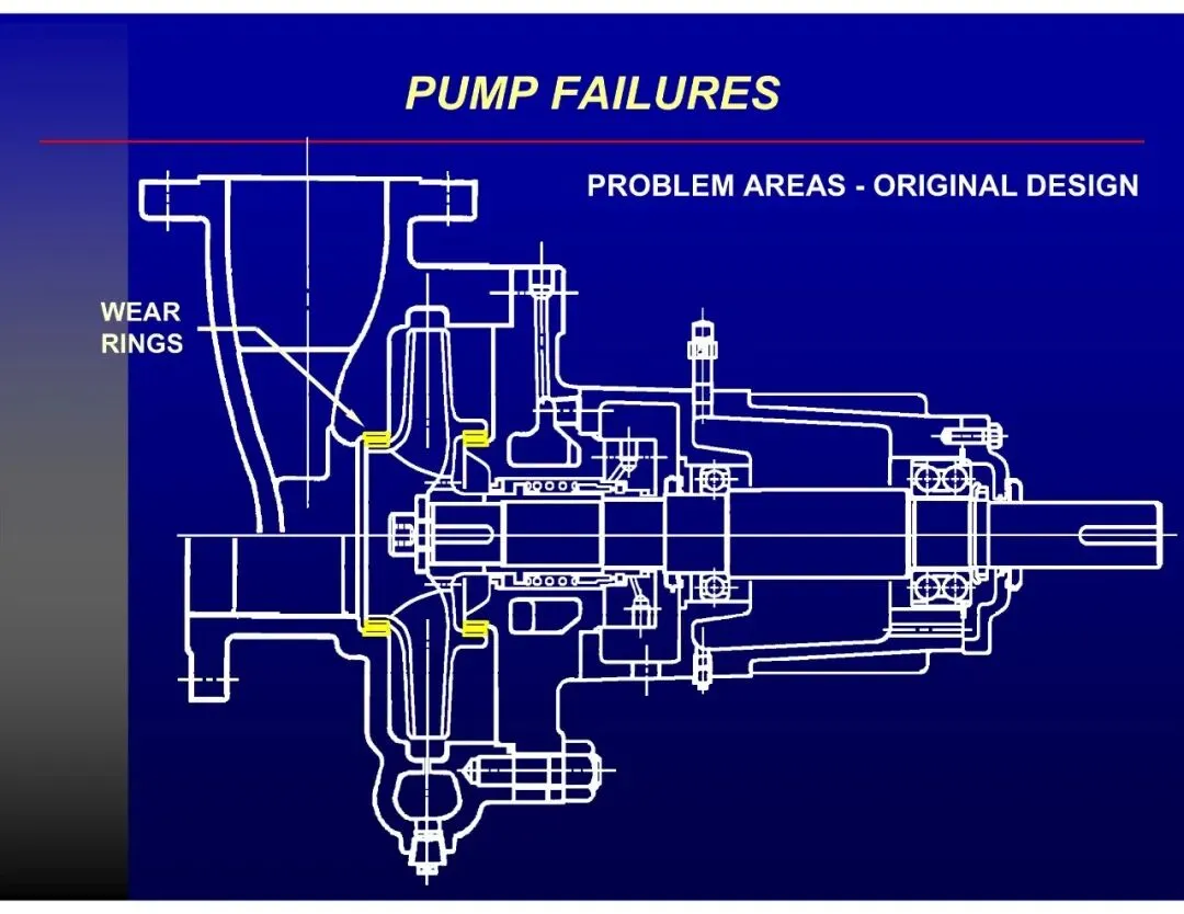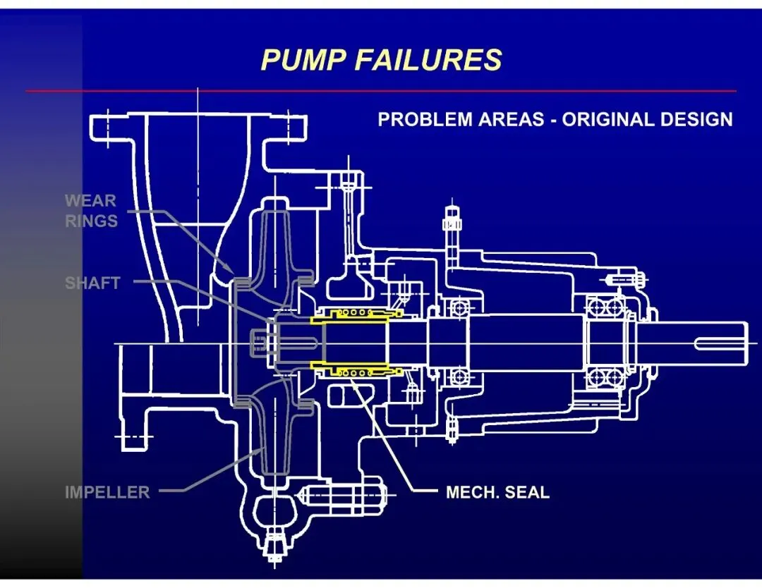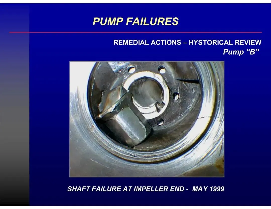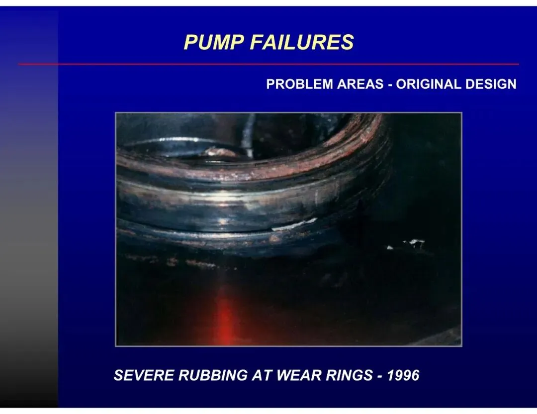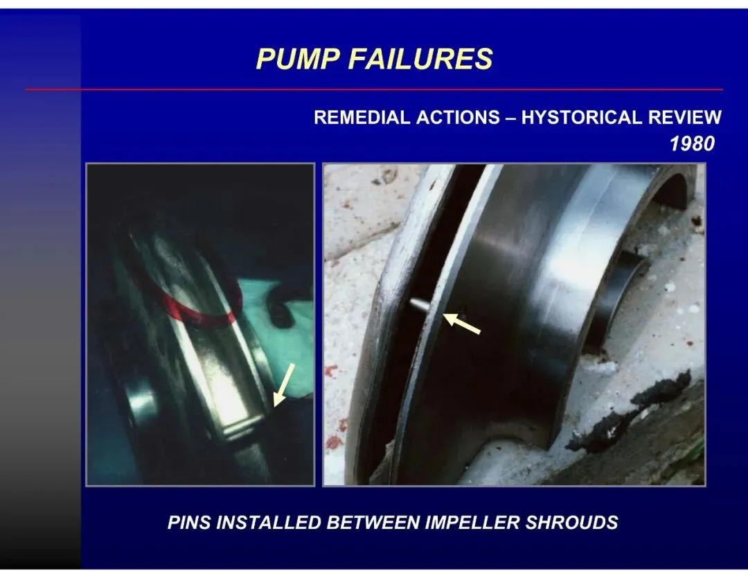 该厂有两台290 kW(390 HP)的泵,由汽轮机或电机驱动,额定流量为262 m³/h(1,153 gpm),扬程为271 m(889 ft)。由于NPSHA偏低且长期处于部分负荷运行状态,这些泵工作在极为苛刻的工况下。设备运行不稳定,振动剧烈,并因以下问题频繁维修:轴反复发生疲劳断裂、口环严重摩擦、叶轮腐蚀/冲蚀、机械密封泄漏以及轴承损坏。