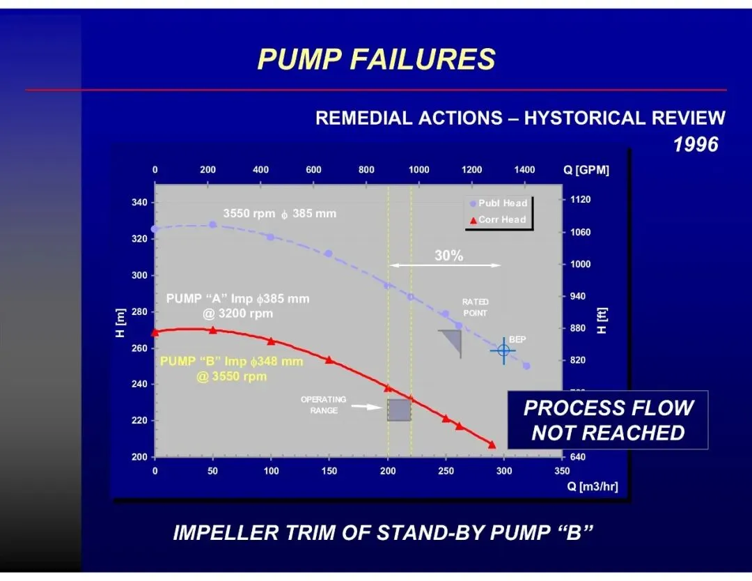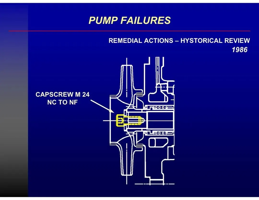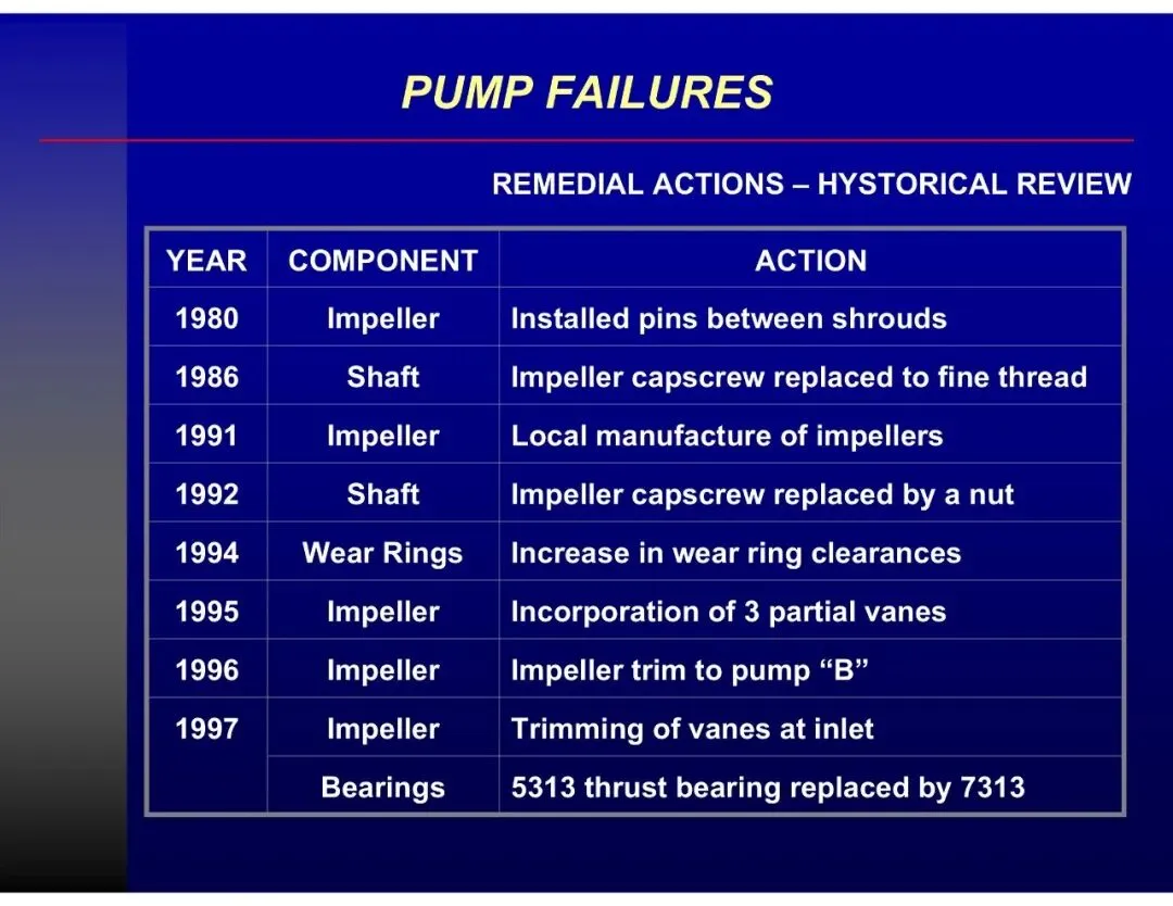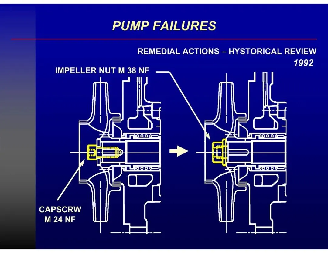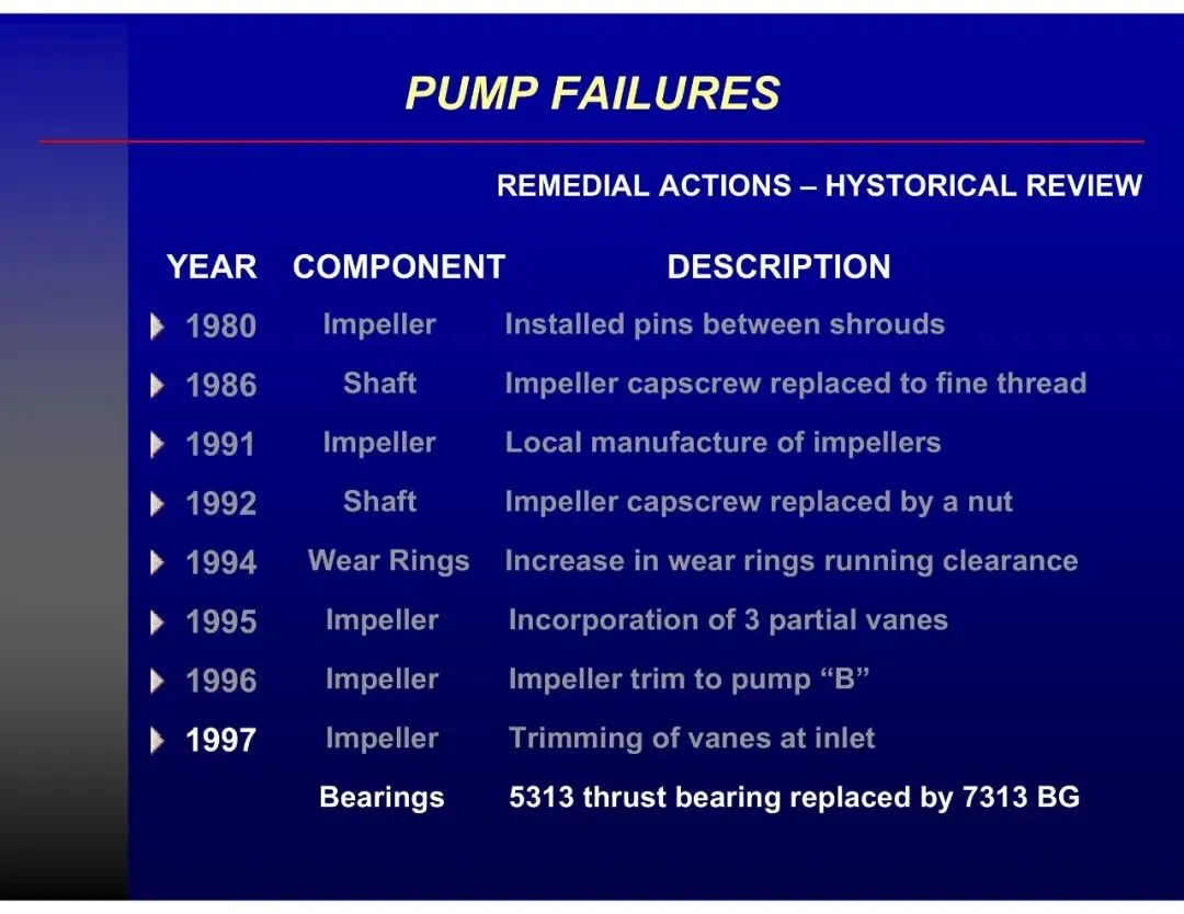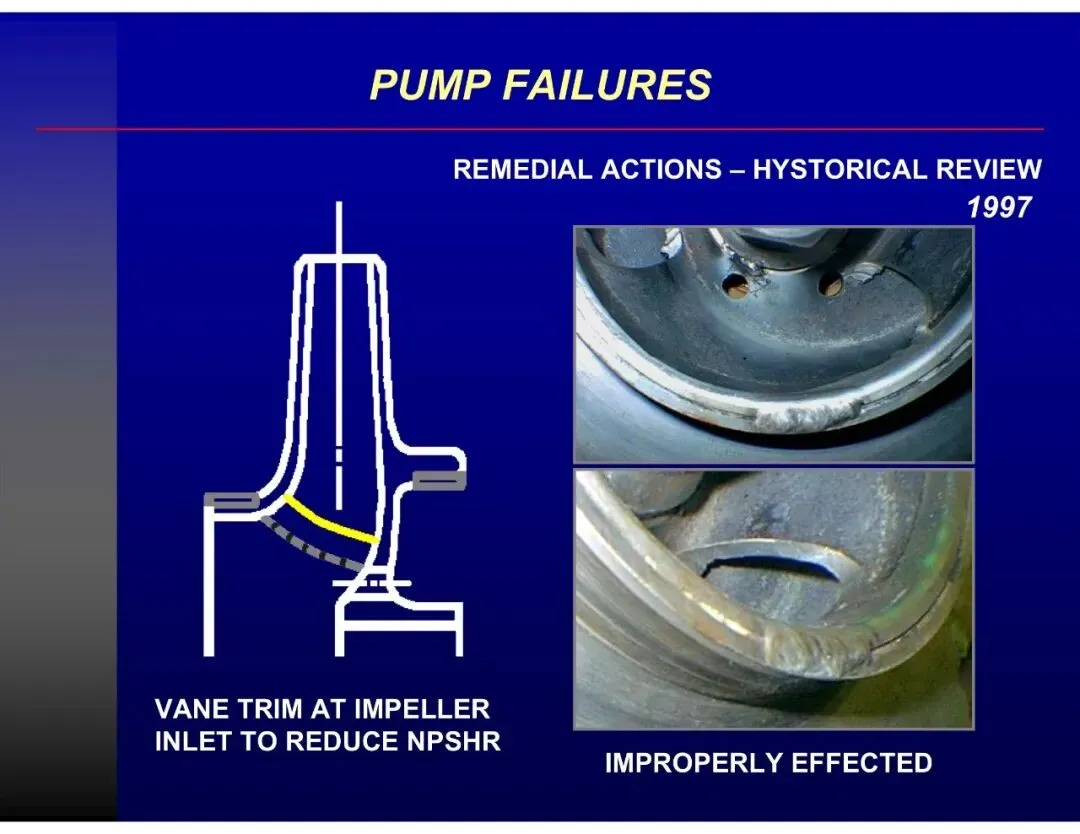 该厂有两台290 kW(390 HP)的泵,由汽轮机或电机驱动,额定流量为262 m³/h(1,153 gpm),扬程为271 m(889 ft)。由于NPSHA偏低且长期处于部分负荷运行状态,这些泵工作在极为苛刻的工况下。设备运行不稳定,振动剧烈,并因以下问题频繁维修:轴反复发生疲劳断裂、口环严重摩擦、叶轮腐蚀/冲蚀、机械密封泄漏以及轴承损坏。