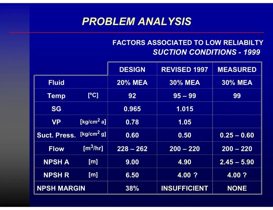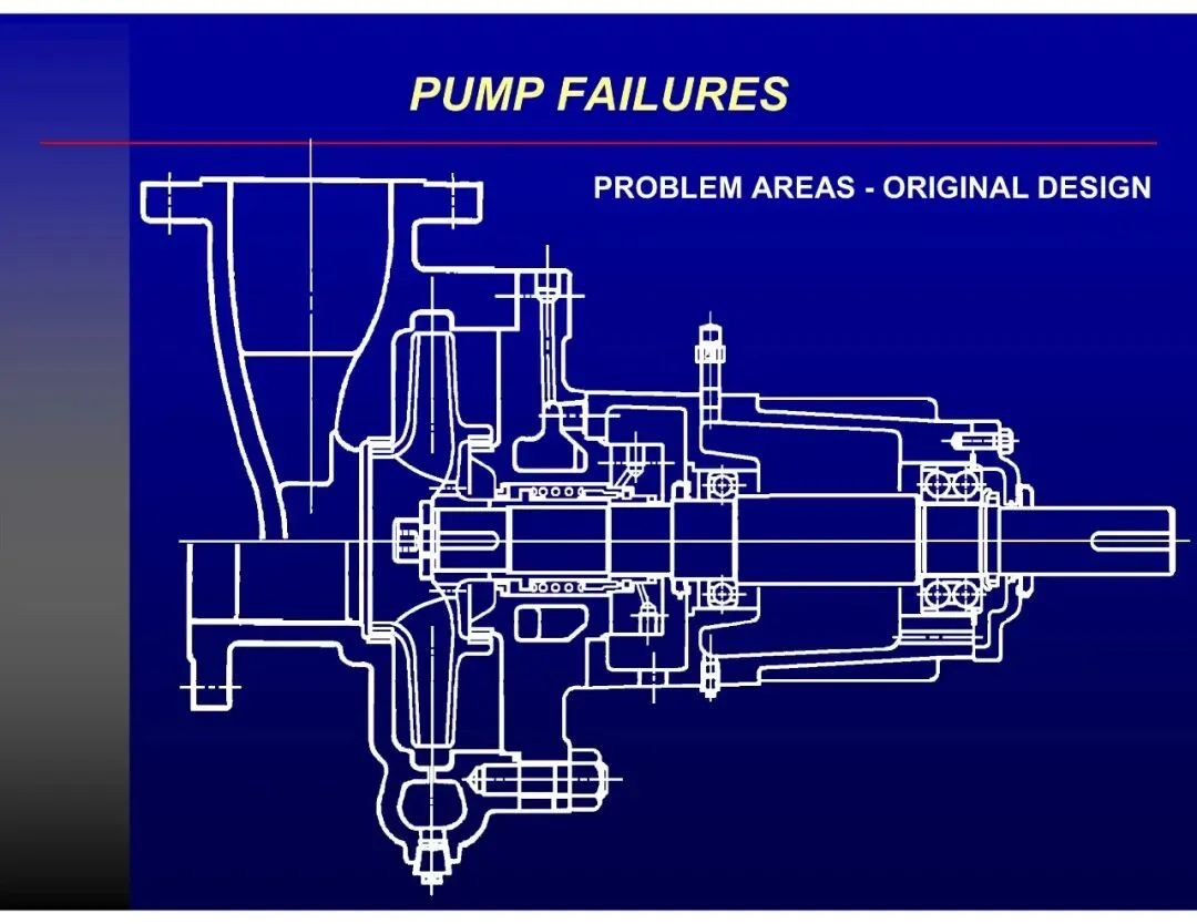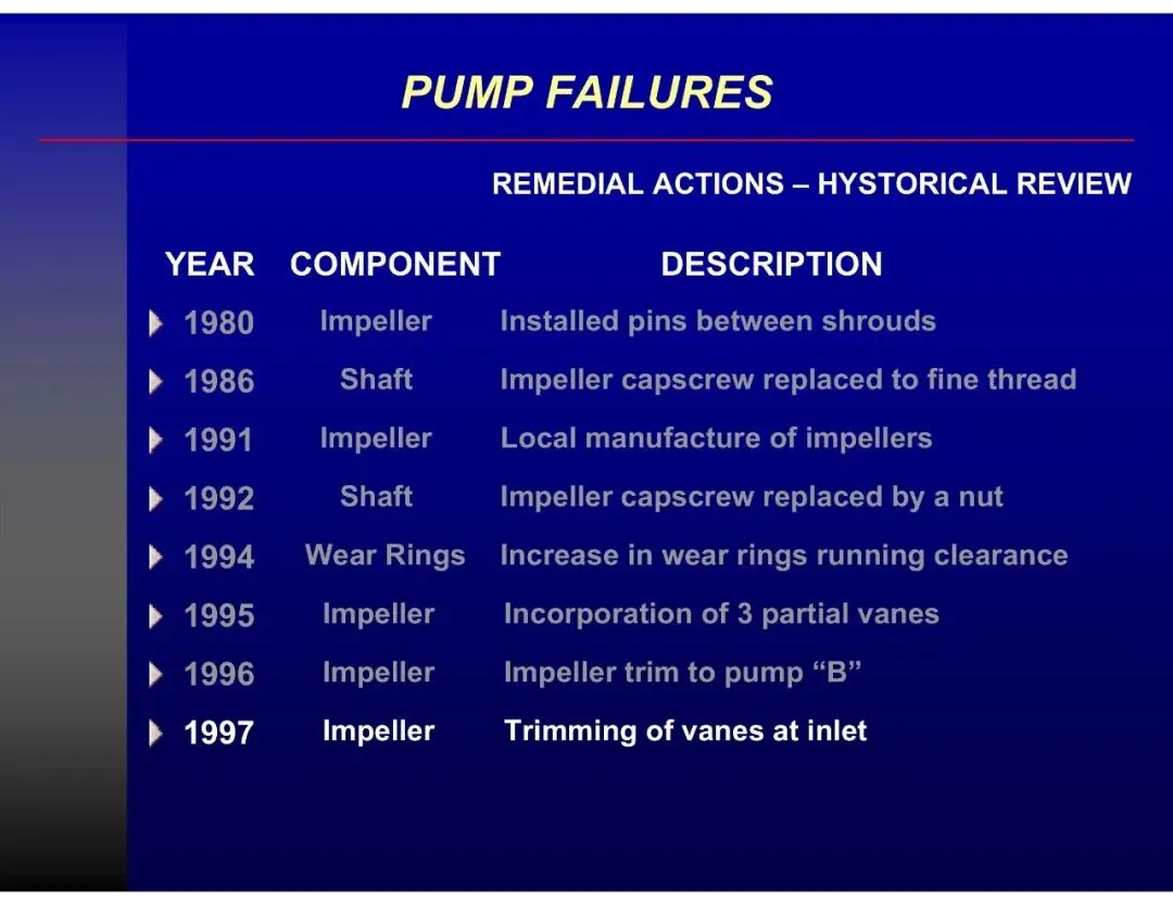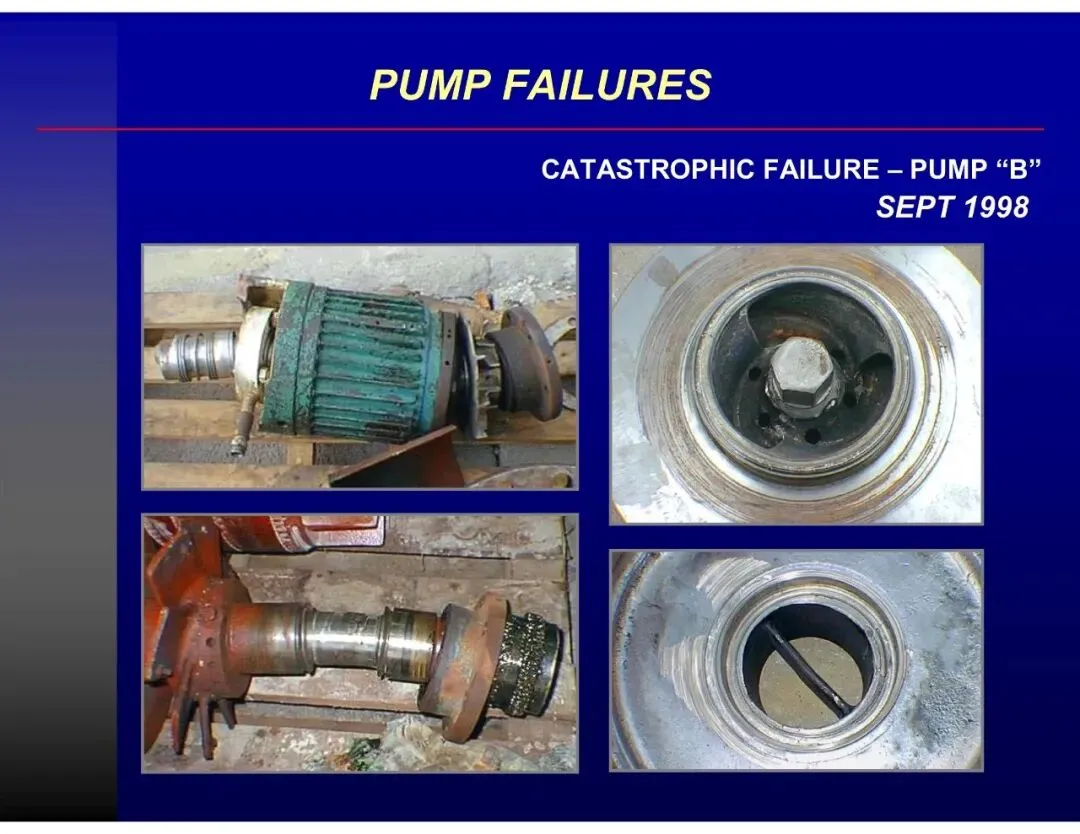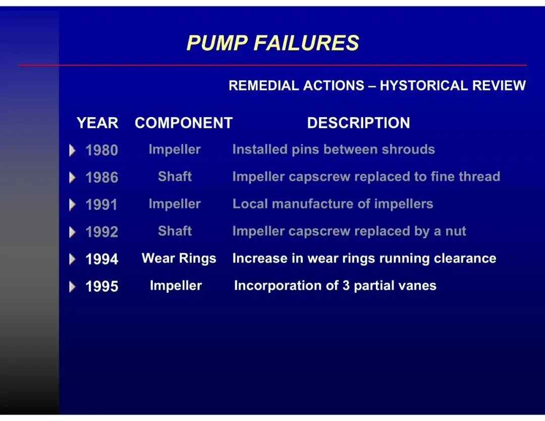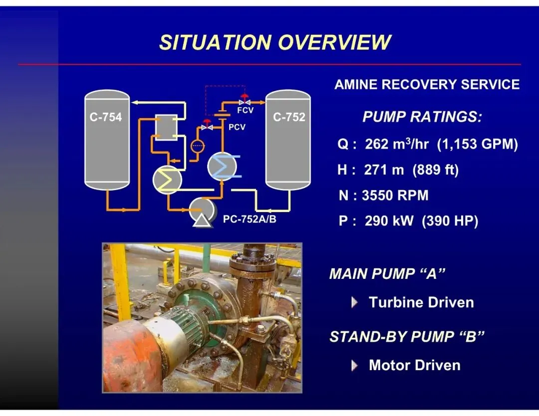 该厂有两台290 kW(390 HP)的泵,由汽轮机或电机驱动,额定流量为262 m³/h(1,153 gpm),扬程为271 m(889 ft)。由于NPSHA偏低且长期处于部分负荷运行状态,这些泵工作在极为苛刻的工况下。设备运行不稳定,振动剧烈,并因以下问题频繁维修:轴反复发生疲劳断裂、口环严重摩擦、叶轮腐蚀/冲蚀、机械密封泄漏以及轴承损坏。