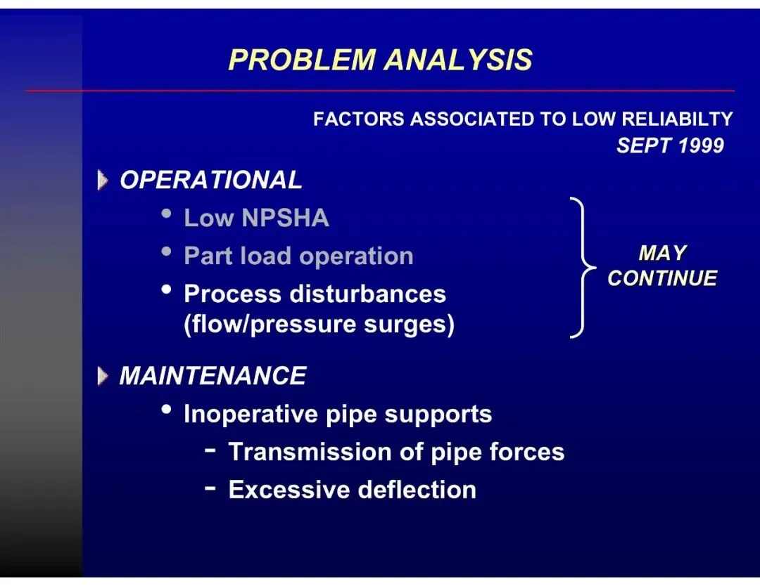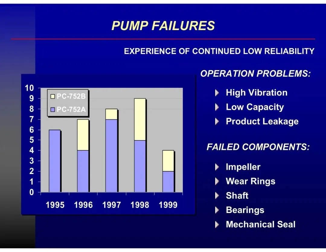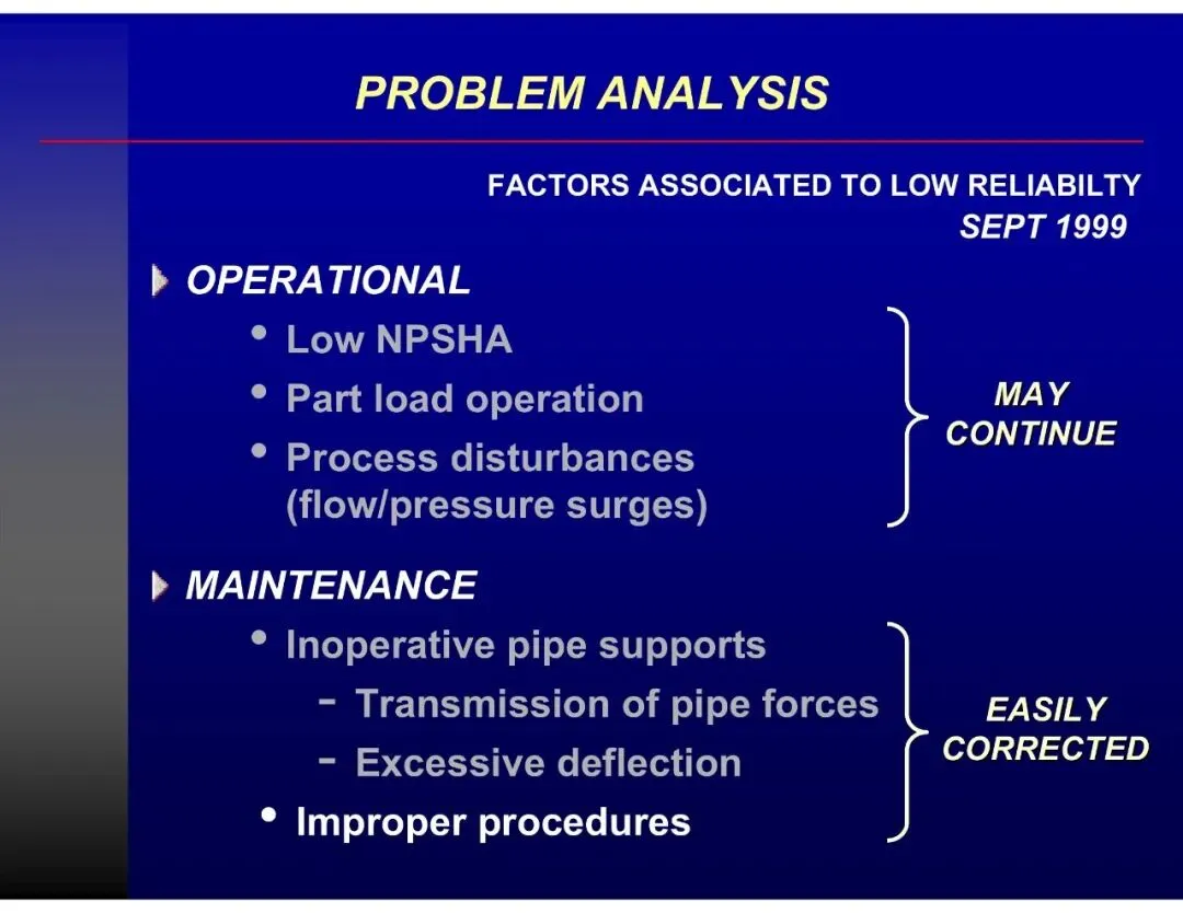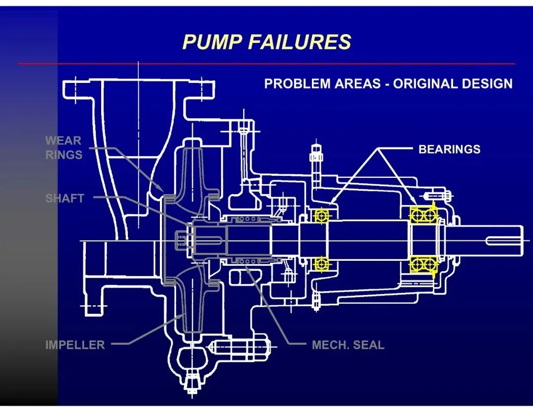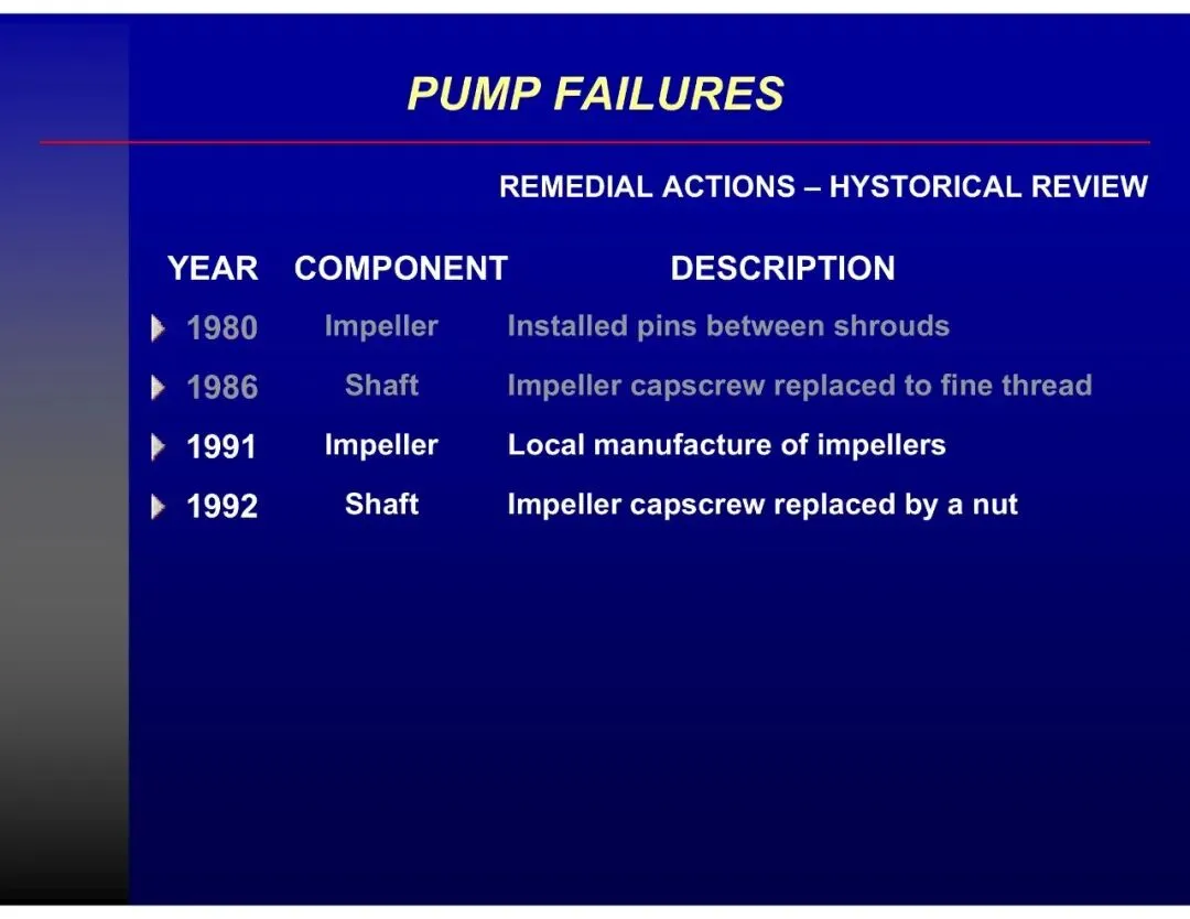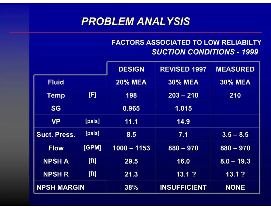 该厂有两台290 kW(390 HP)的泵,由汽轮机或电机驱动,额定流量为262 m³/h(1,153 gpm),扬程为271 m(889 ft)。由于NPSHA偏低且长期处于部分负荷运行状态,这些泵工作在极为苛刻的工况下。设备运行不稳定,振动剧烈,并因以下问题频繁维修:轴反复发生疲劳断裂、口环严重摩擦、叶轮腐蚀/冲蚀、机械密封泄漏以及轴承损坏。