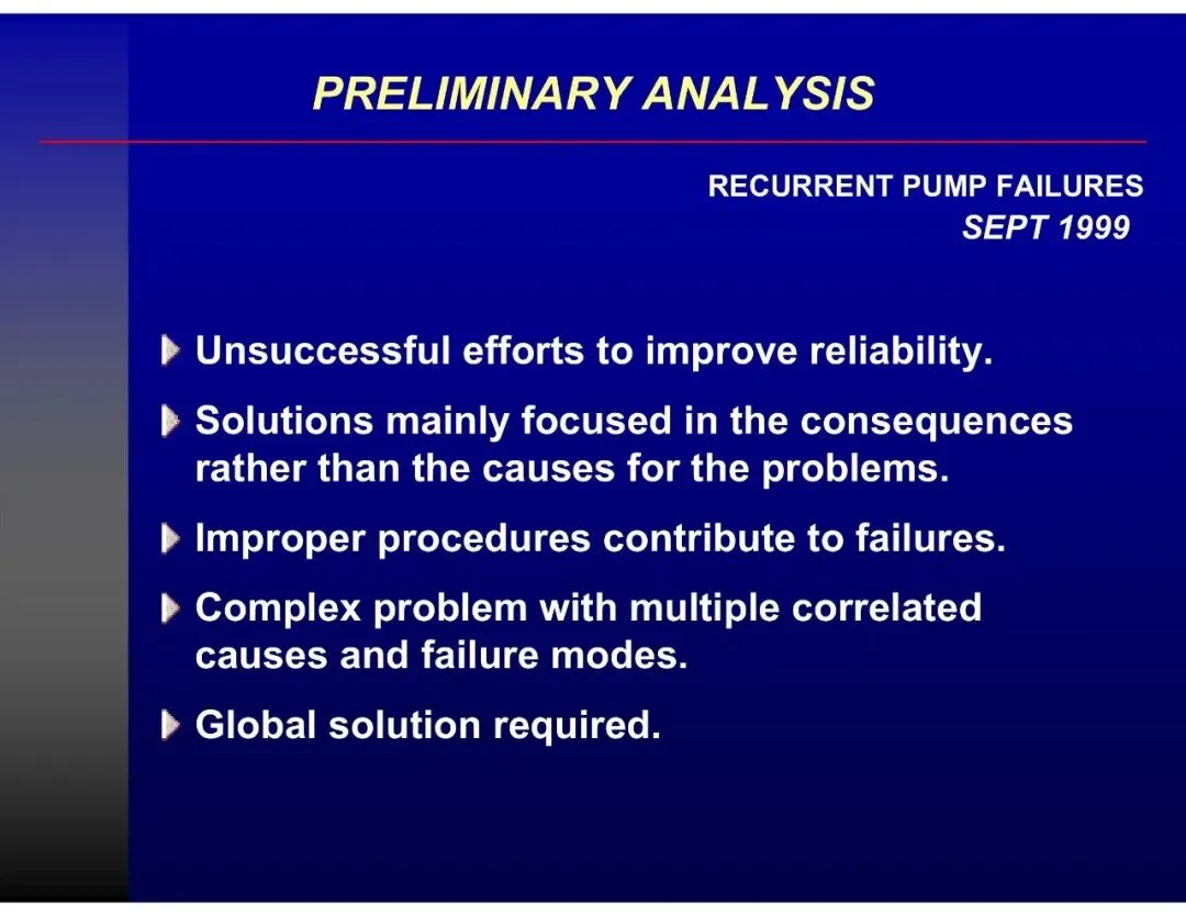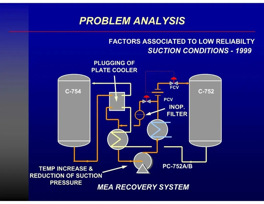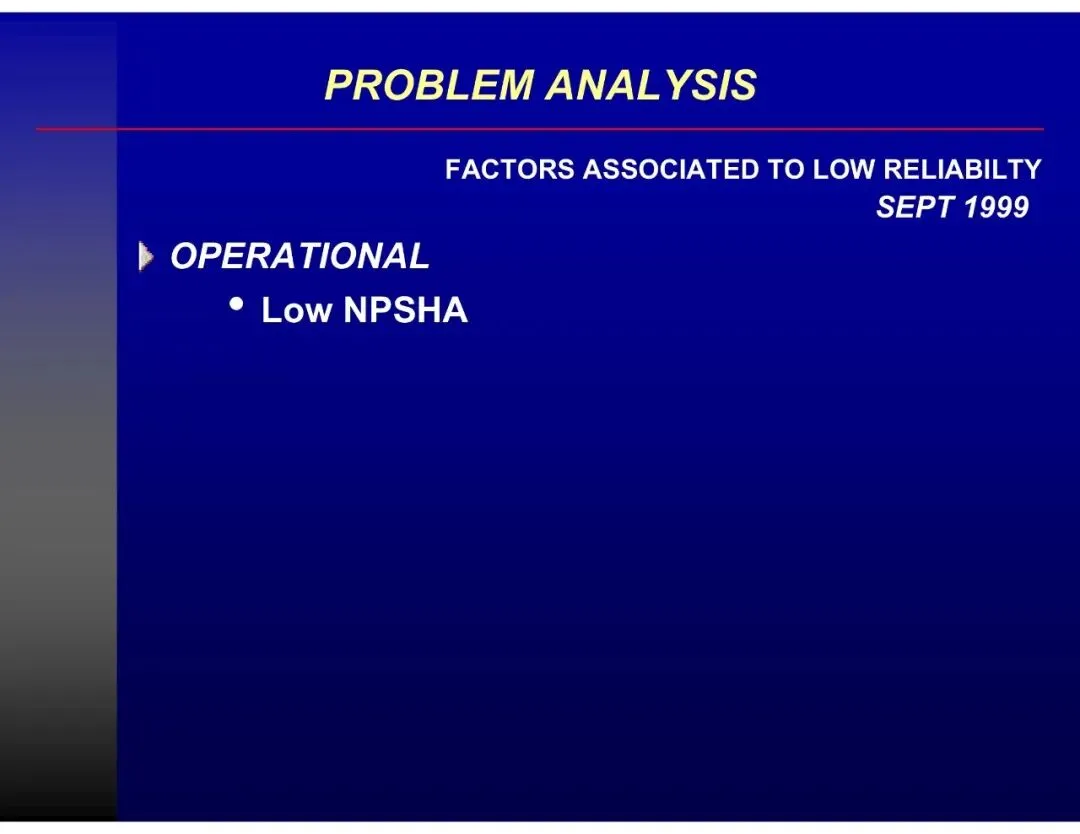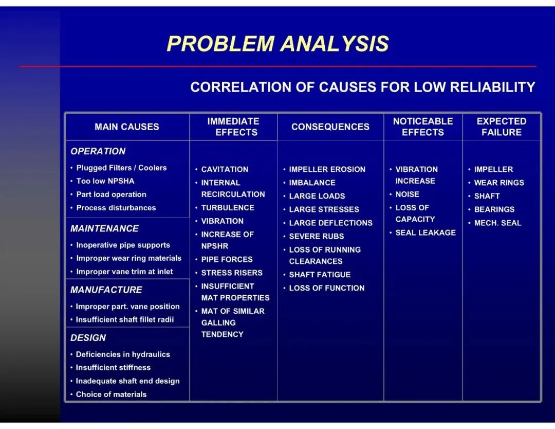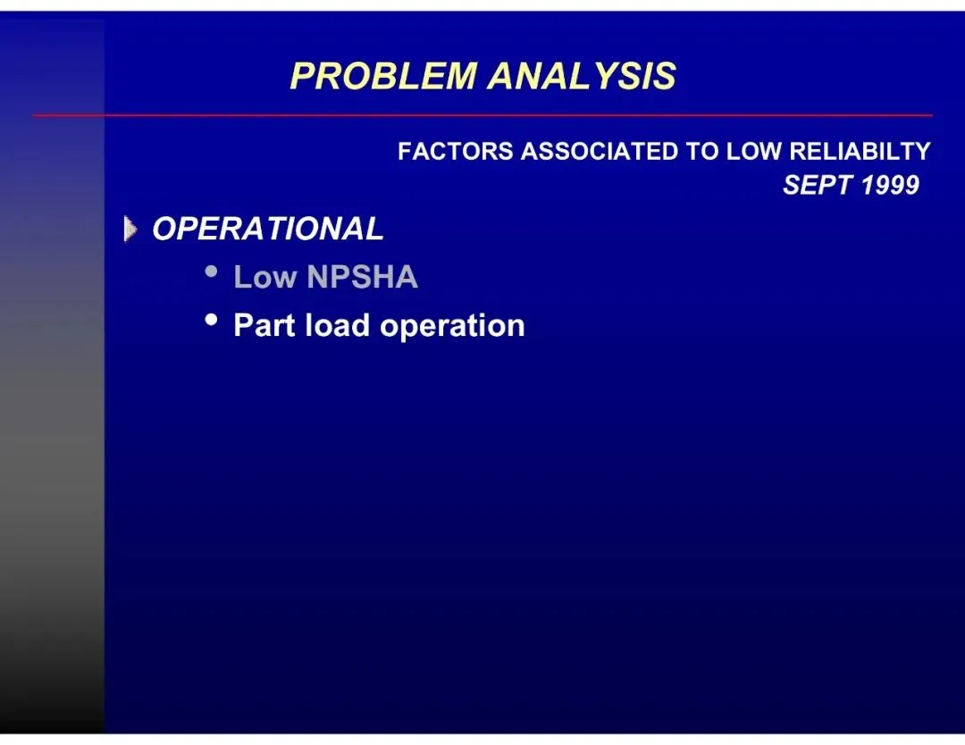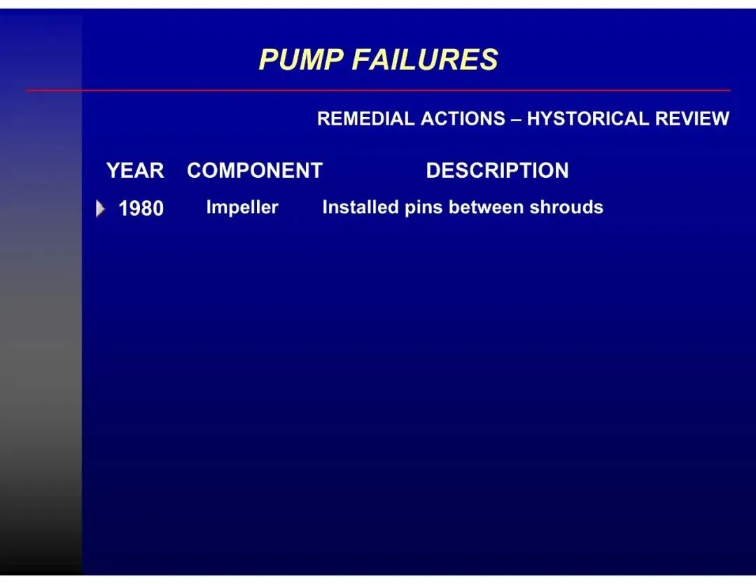 该厂有两台290 kW(390 HP)的泵,由汽轮机或电机驱动,额定流量为262 m³/h(1,153 gpm),扬程为271 m(889 ft)。由于NPSHA偏低且长期处于部分负荷运行状态,这些泵工作在极为苛刻的工况下。设备运行不稳定,振动剧烈,并因以下问题频繁维修:轴反复发生疲劳断裂、口环严重摩擦、叶轮腐蚀/冲蚀、机械密封泄漏以及轴承损坏。