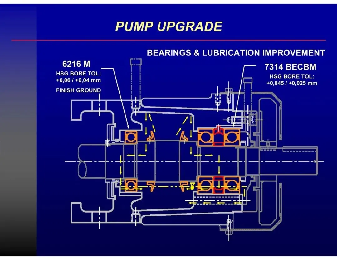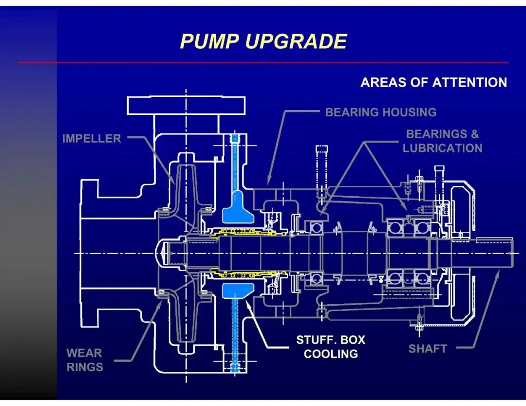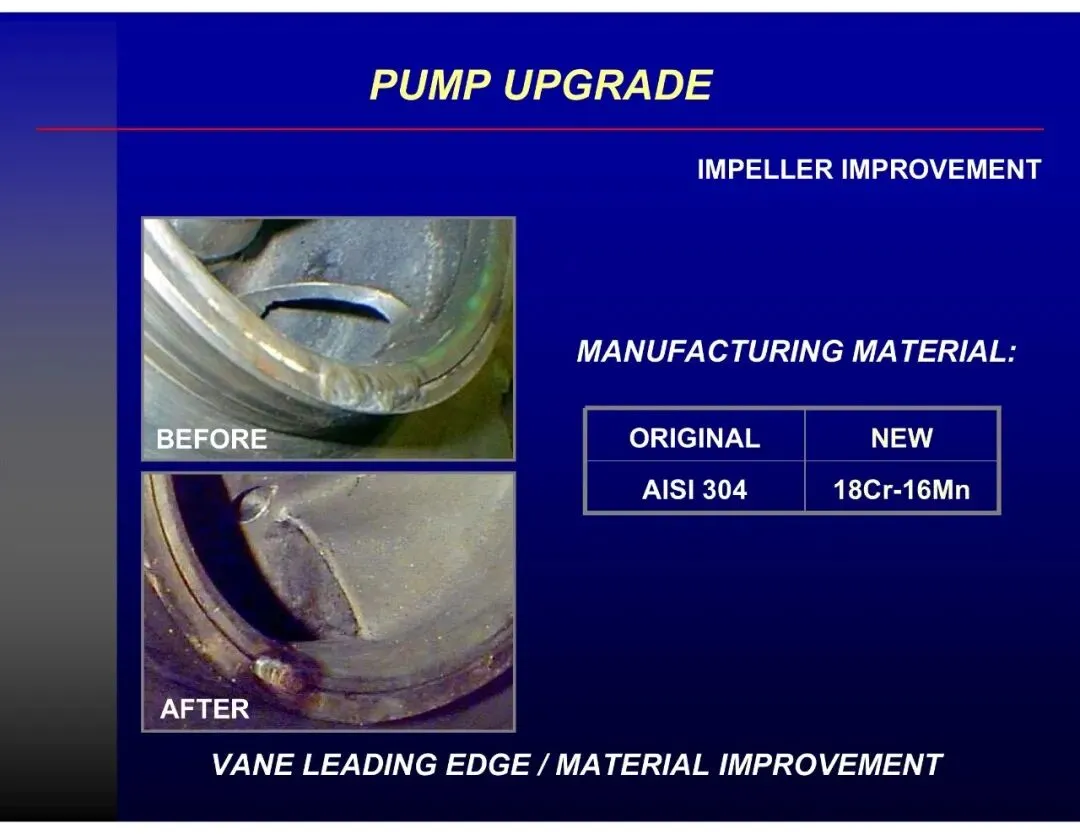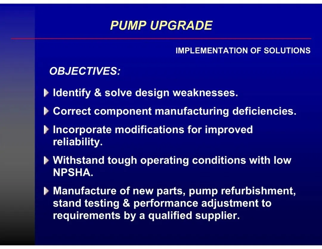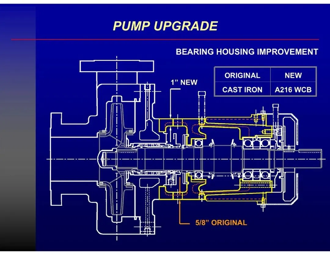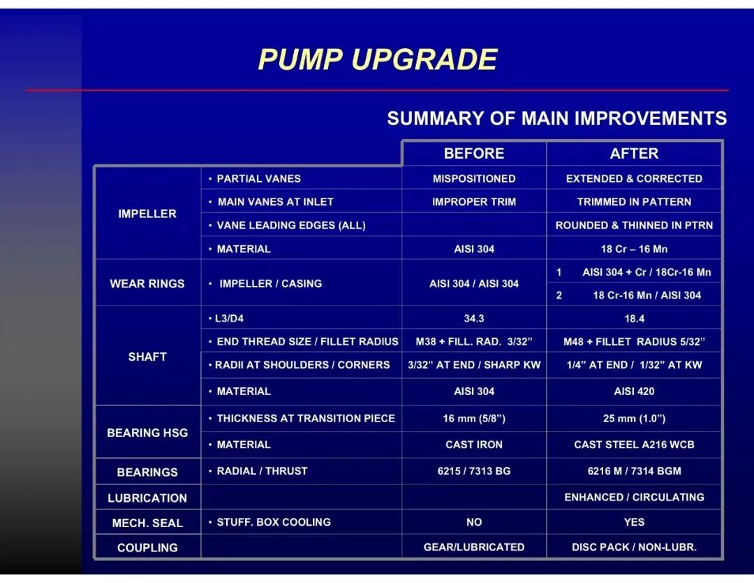 在一次灾难性故障(同时损坏了泵和电动机)导致全厂紧急停车后,对该泵实施了系统性升级。升级目标是克服原有设计缺陷,并引入提升可靠性的关键特性。具体措施包括:识别并修正叶轮的设计不足,同时改进其材料以抵抗严重的汽蚀和回流造成的损伤;对动力端进行了全面重新设计,采用更大直径的轴、增强轴承座刚度、升级材料、使用超规格轴承,并优化润滑系统。