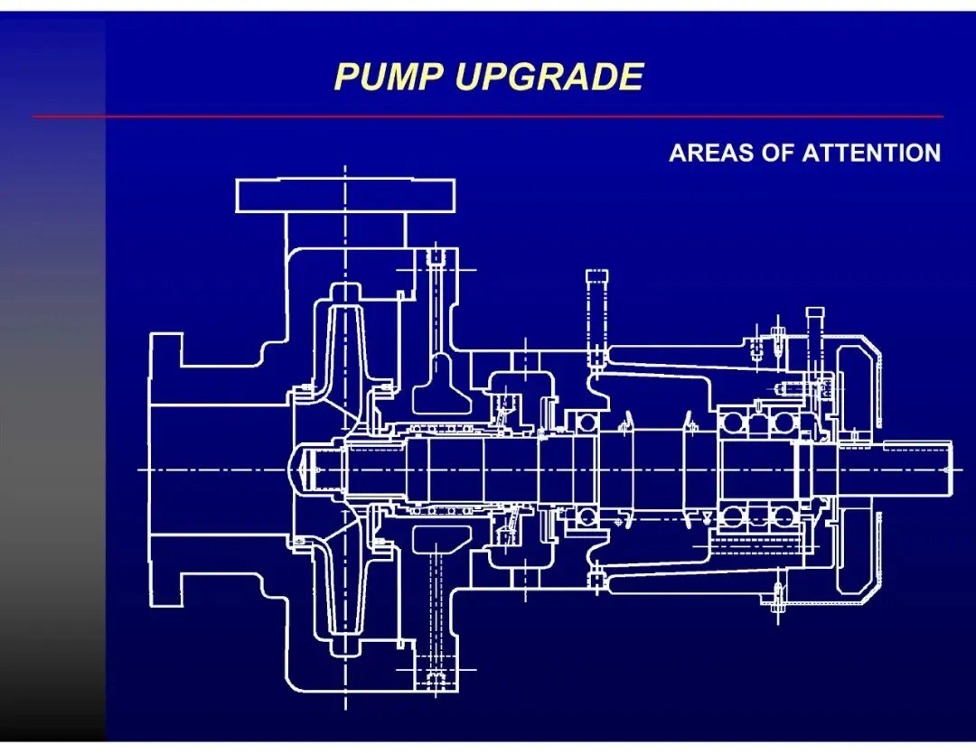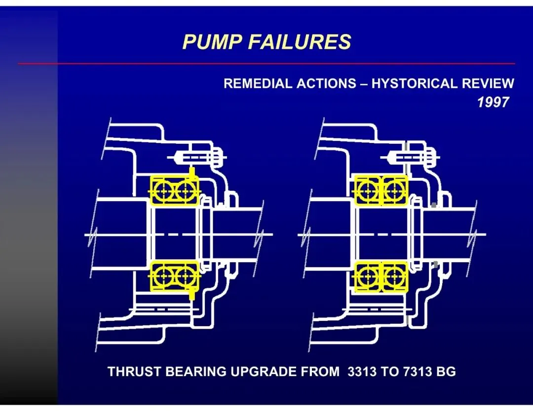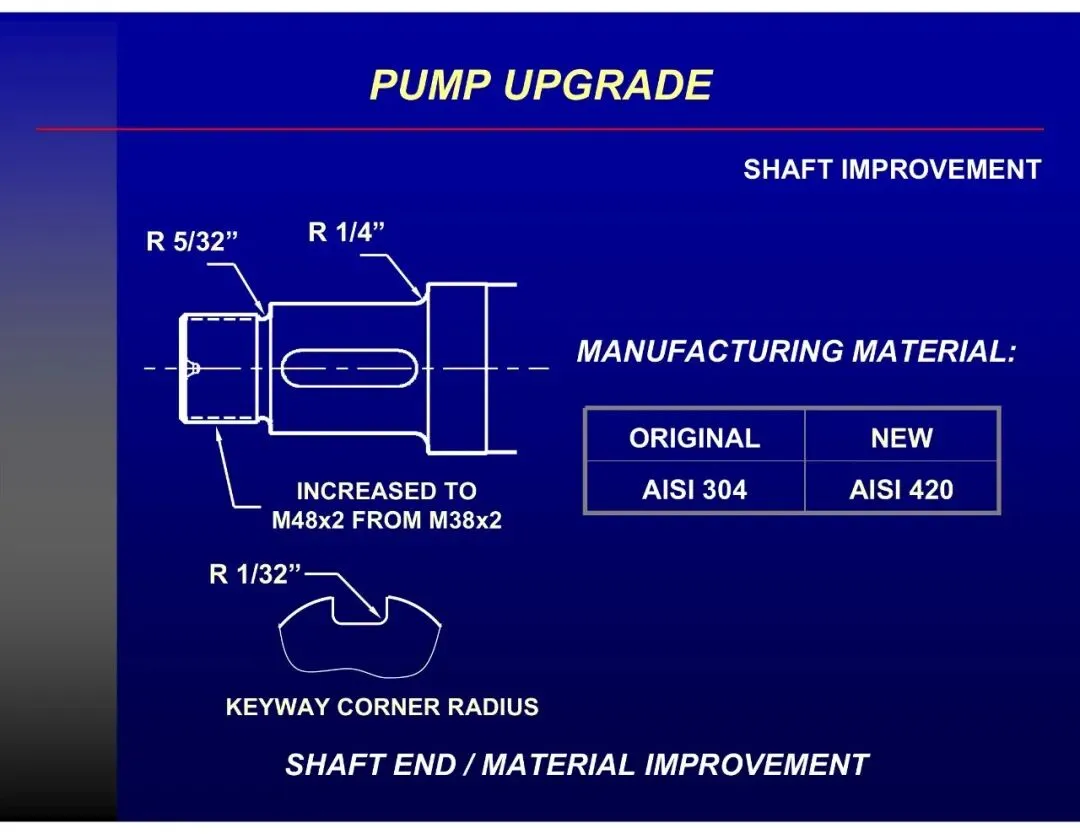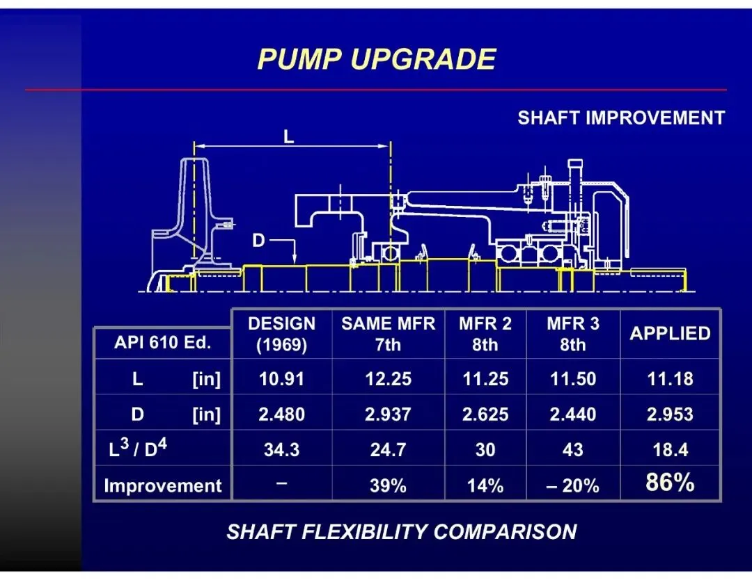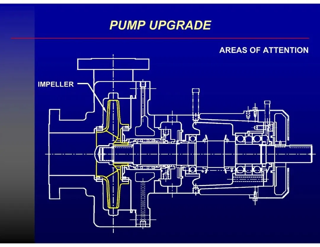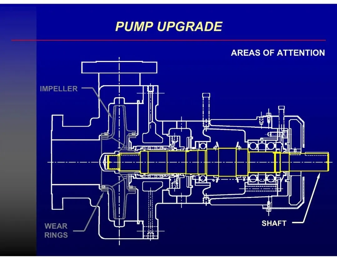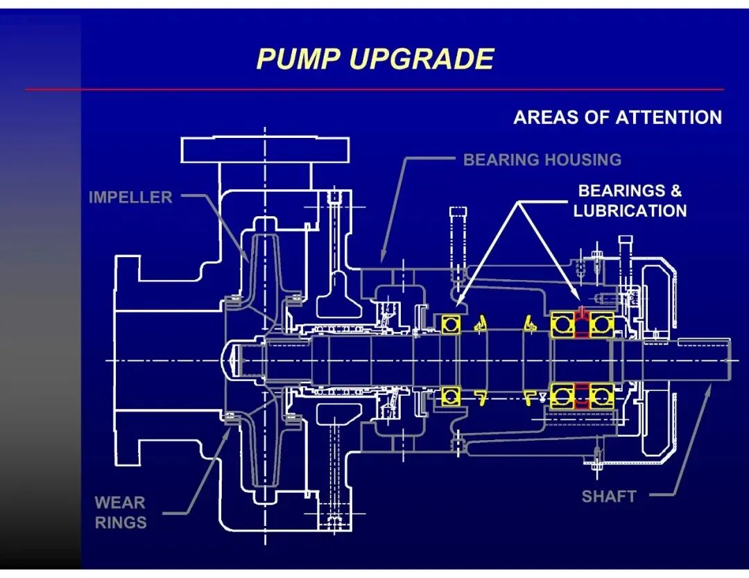在一次灾难性故障(同时损坏了泵和电动机)导致全厂紧急停车后,对该泵实施了系统性升级。升级目标是克服原有设计缺陷,并引入提升可靠性的关键特性。具体措施包括:识别并修正叶轮的设计不足,同时改进其材料以抵抗严重的汽蚀和回流造成的损伤;对动力端进行了全面重新设计,采用更大直径的轴、增强轴承座刚度、升级材料、使用超规格轴承,并优化润滑系统。