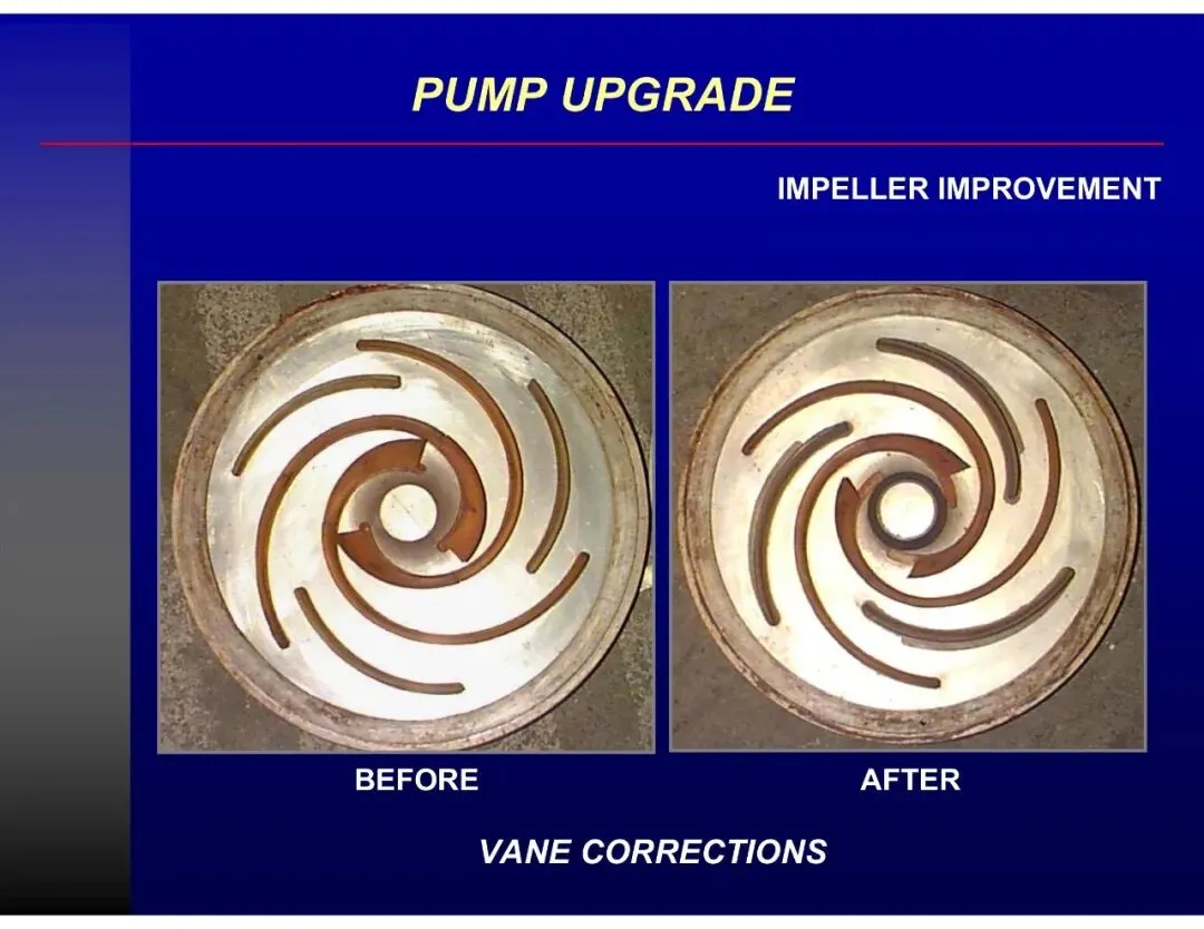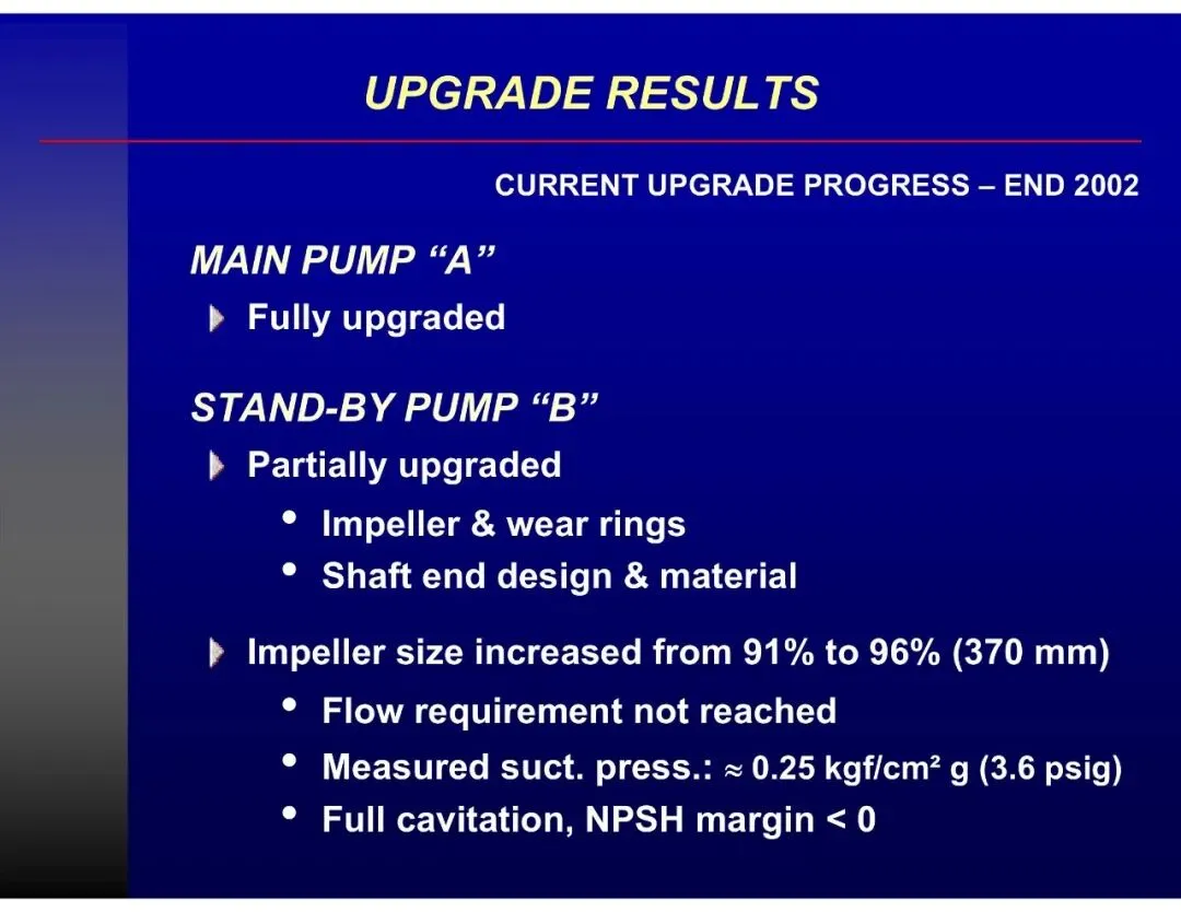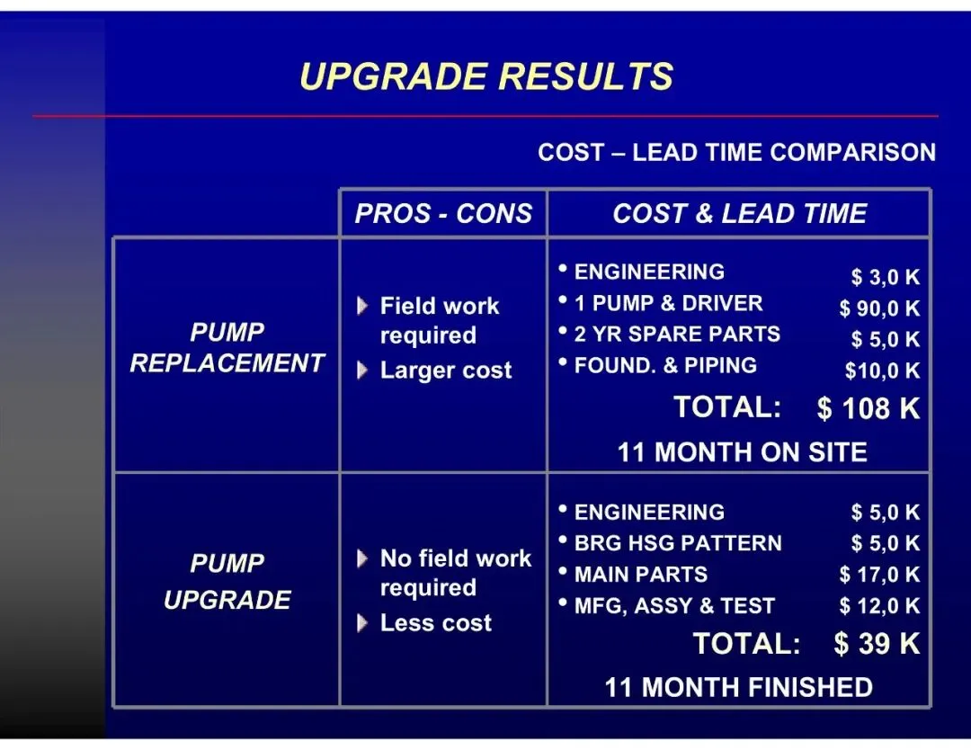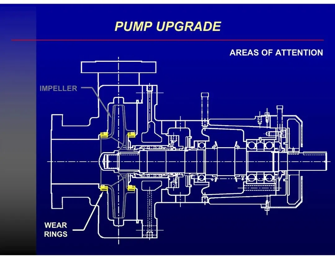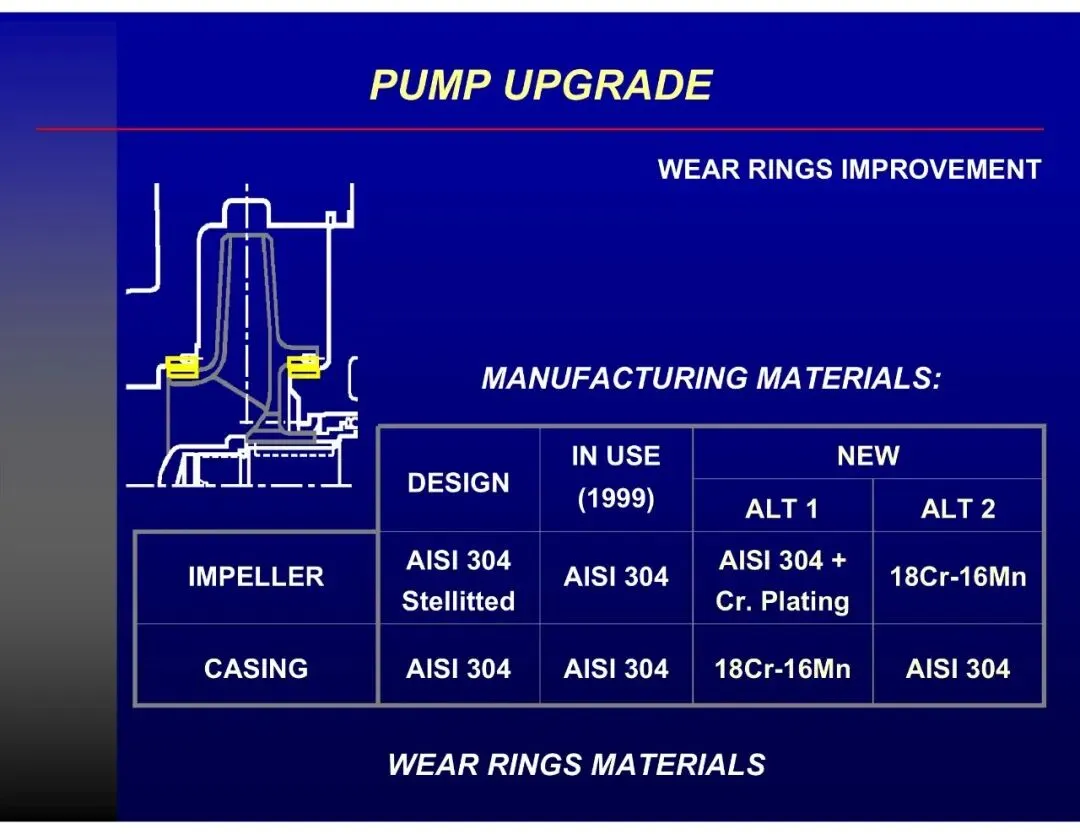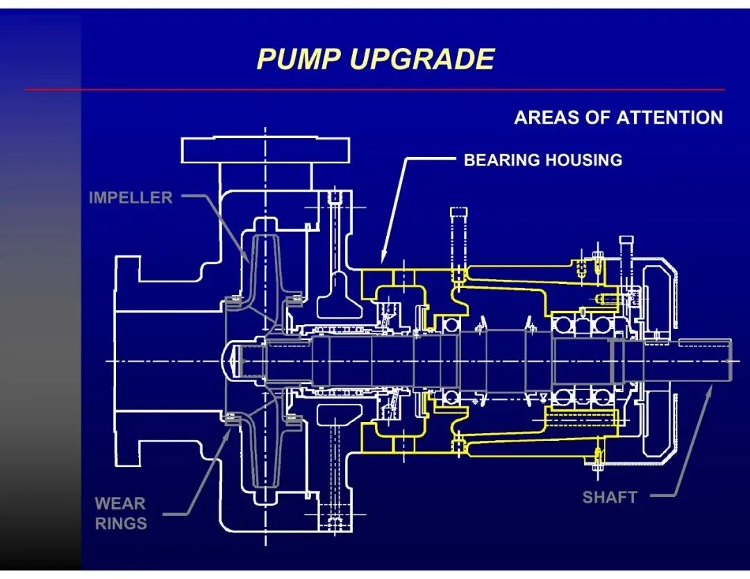 在一次灾难性故障(同时损坏了泵和电动机)导致全厂紧急停车后,对该泵实施了系统性升级。升级目标是克服原有设计缺陷,并引入提升可靠性的关键特性。具体措施包括:识别并修正叶轮的设计不足,同时改进其材料以抵抗严重的汽蚀和回流造成的损伤;对动力端进行了全面重新设计,采用更大直径的轴、增强轴承座刚度、升级材料、使用超规格轴承,并优化润滑系统。