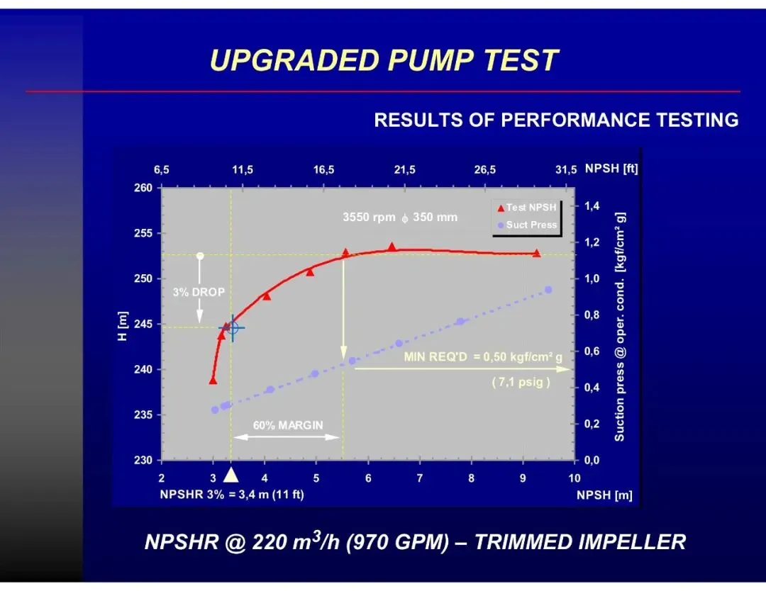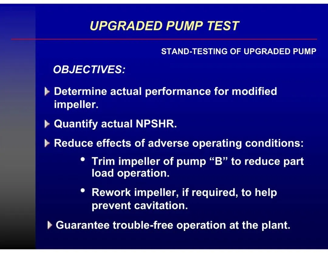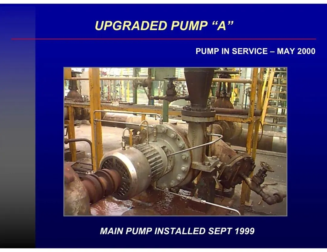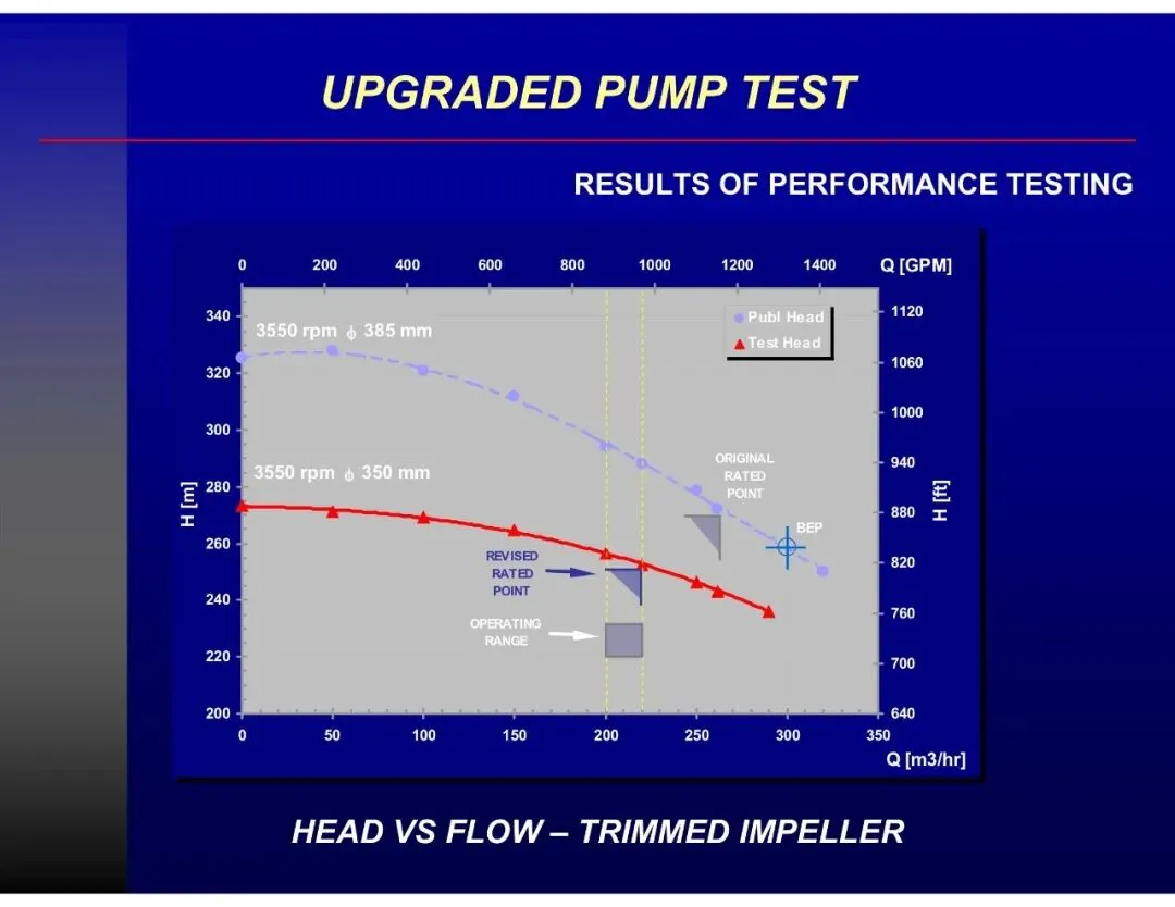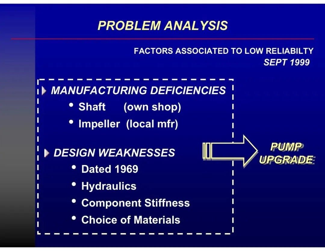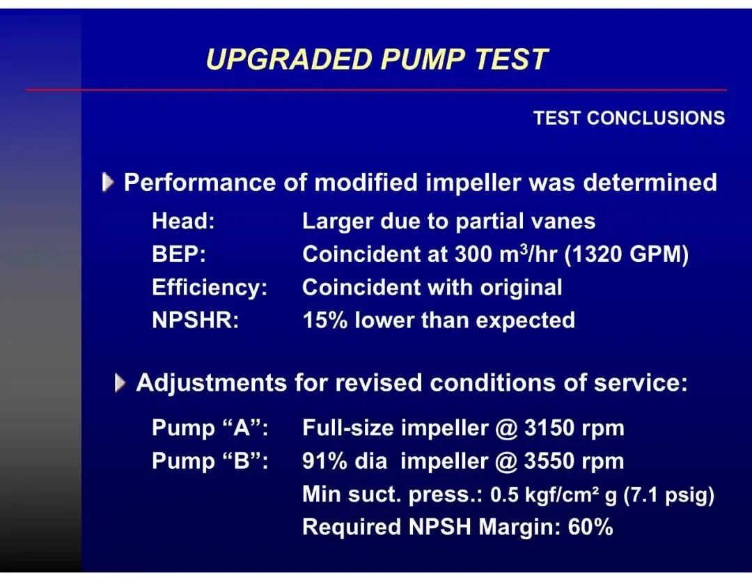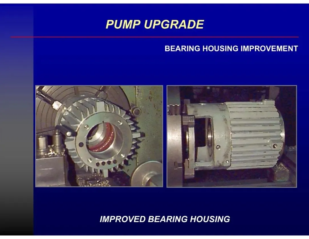 在一次灾难性故障(同时损坏了泵和电动机)导致全厂紧急停车后,对该泵实施了系统性升级。升级目标是克服原有设计缺陷,并引入提升可靠性的关键特性。具体措施包括:识别并修正叶轮的设计不足,同时改进其材料以抵抗严重的汽蚀和回流造成的损伤;对动力端进行了全面重新设计,采用更大直径的轴、增强轴承座刚度、升级材料、使用超规格轴承,并优化润滑系统。