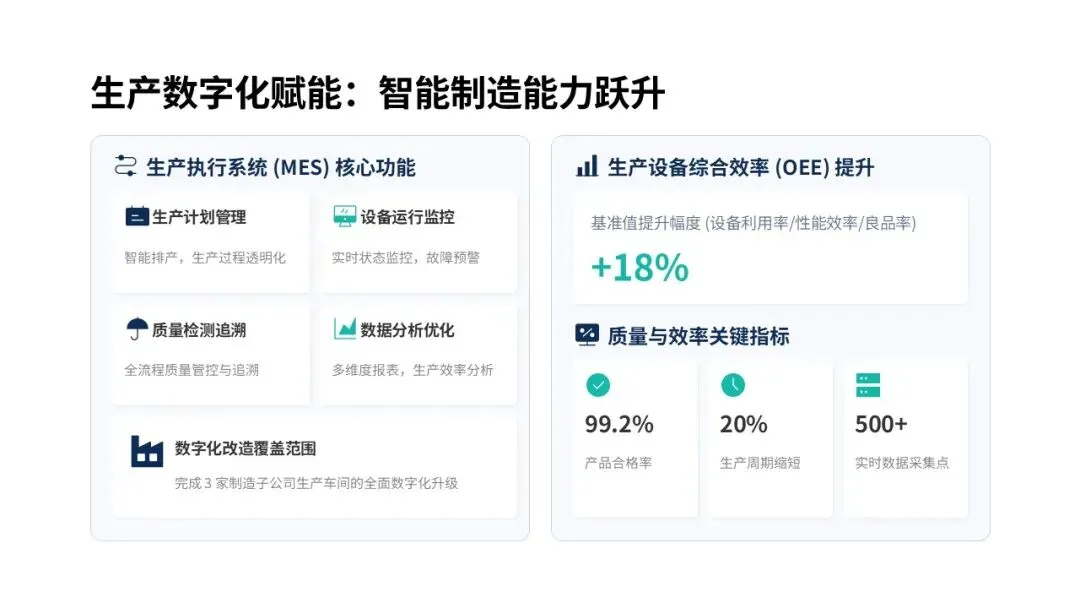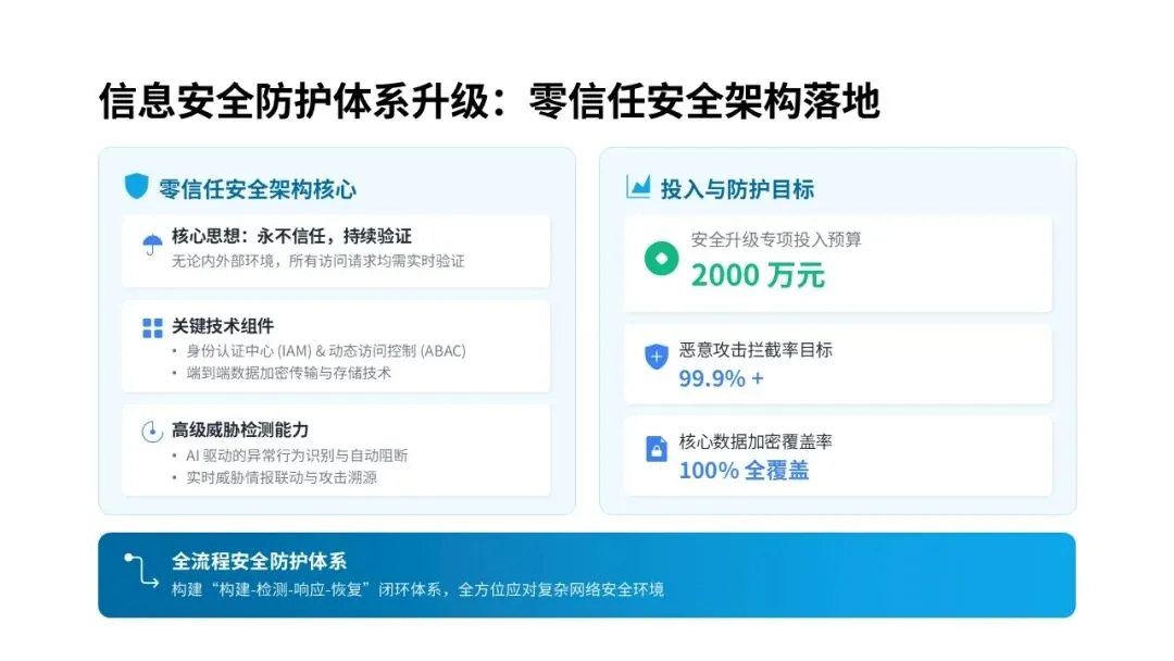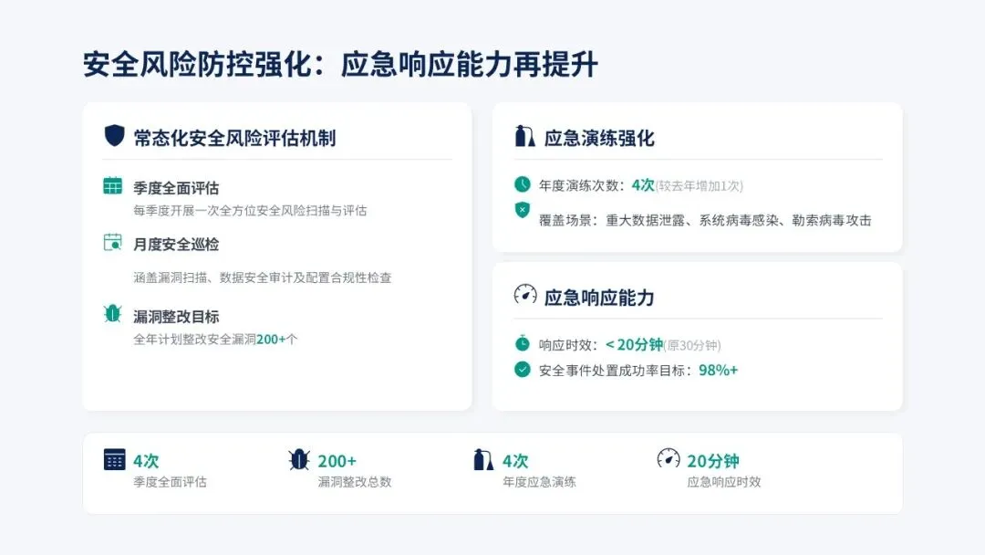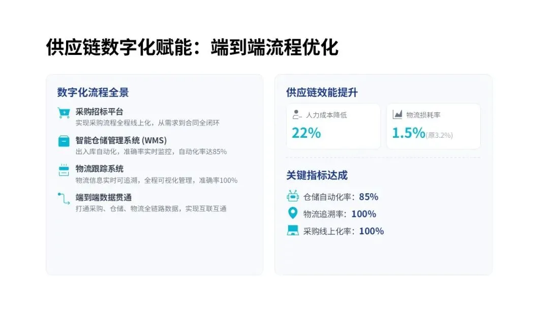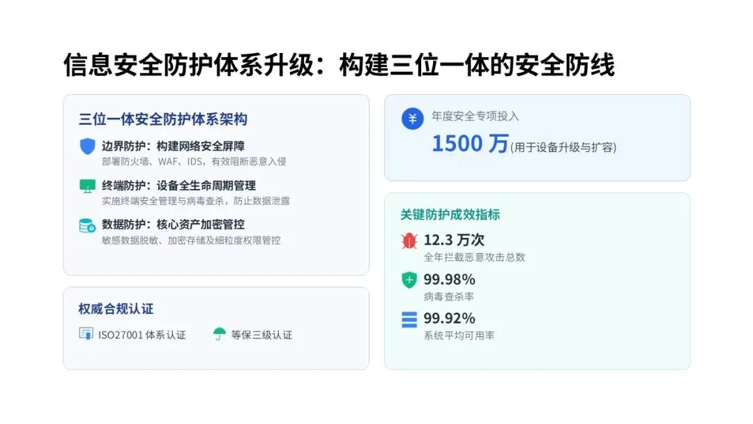 数字化的价值,最终体现在业务的提质增效上。在财务领域,自动化率提升至92%,资金支付审核从“按天算”进入“按小时计”的时代;在营销端,我们打通了线上线下全渠道,线上销售占比突破52%,活动转化率提升了25%;在供应链与生产环节,仓储自动化率达到85%,生产设备综合效率(OEE)提升18%,真正实现了端到端的流程优化。更令人振奋的是,全年通过数据驱动的业务创新,直接创造的经济效益超过了5000万元。安全防线的全面筑牢