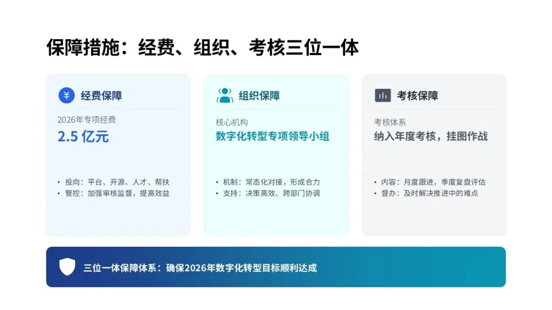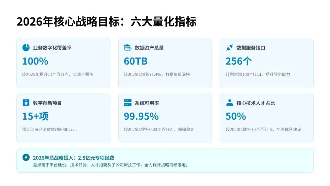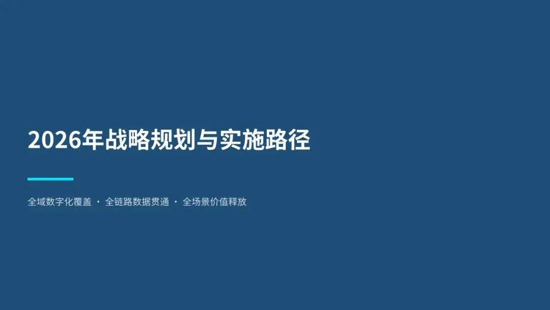 2026年,我们将迎来数字化转型的深化之年、价值全面释放之年。我们的目标是:实现“全域数字化覆盖、全链路数据贯通、全场景价值释放”。为此,我们制定了清晰的路线图和六大量化目标,计划投入2.5亿元专项资金,确保战略落地。攻坚均衡,实现全域覆盖