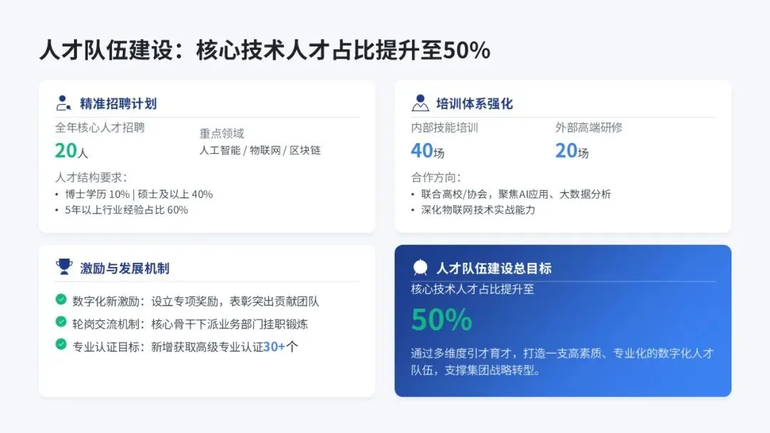 转型的关键在人。我们将加大对AI、大数据等领域核心技术人才的引进和培养力度,目标将核心技术人才占比提升至50%。同时,通过建立“经费、组织、考核”三位一体的保障体系,确保每一项规划都能落到实处。结语