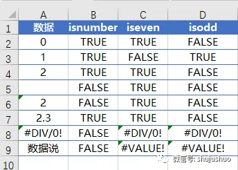 另一方面,对于空单元格、错误值、文本这些无法转换成数字的情况,isnumebr照旧返回False,而iseven和isodd只有在无法转换成数字时才会返回错误,而空单元格当作0处理,被判断为偶数。