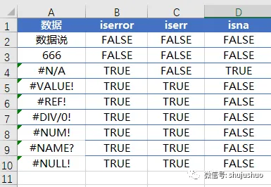 3个函数的共同点是遇到正常值,全部返回False;不同的地方是,遇到错误值时,iserror函数全部返回True,而iserr和isna刚好相反,iserr函数是忽略#N/A 错误,返回false,其他返回true,isna是只判断#N/A错误,其他的返回false。