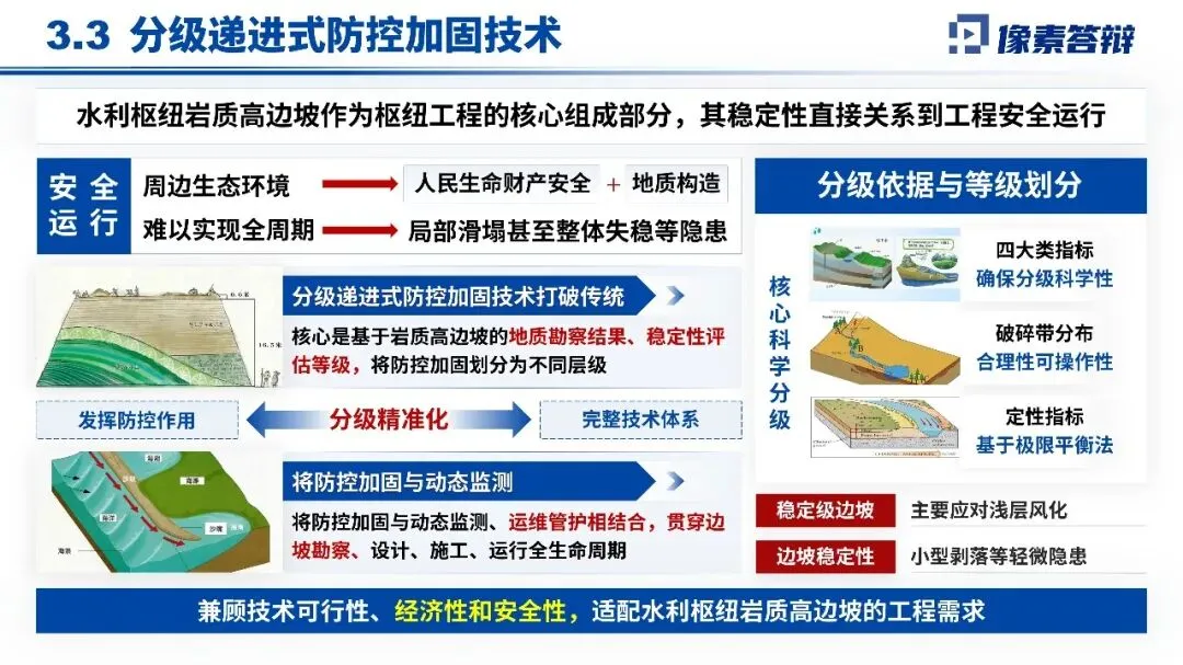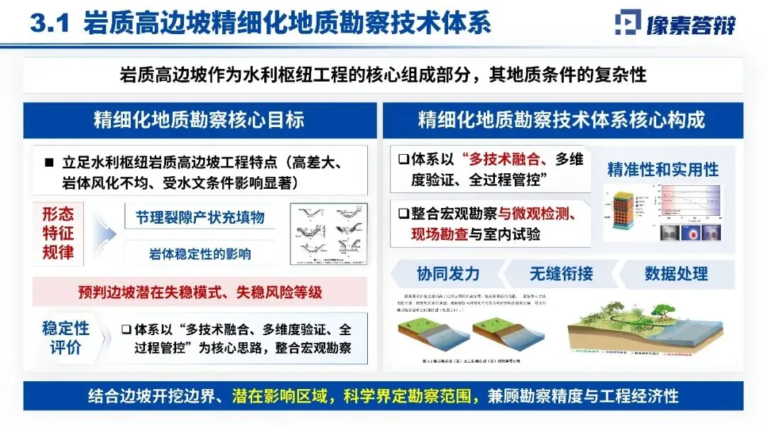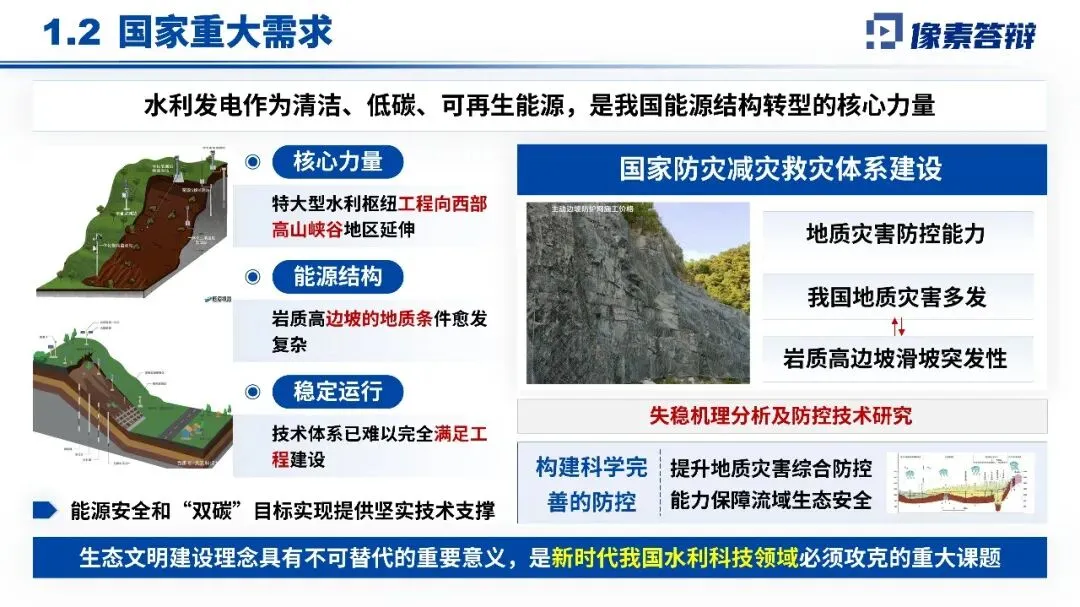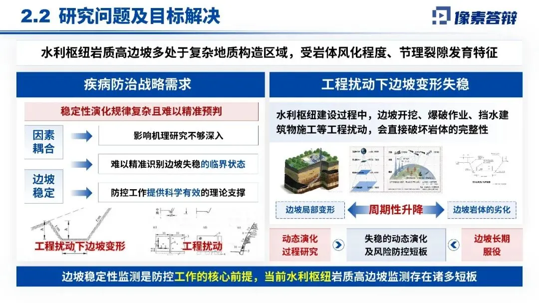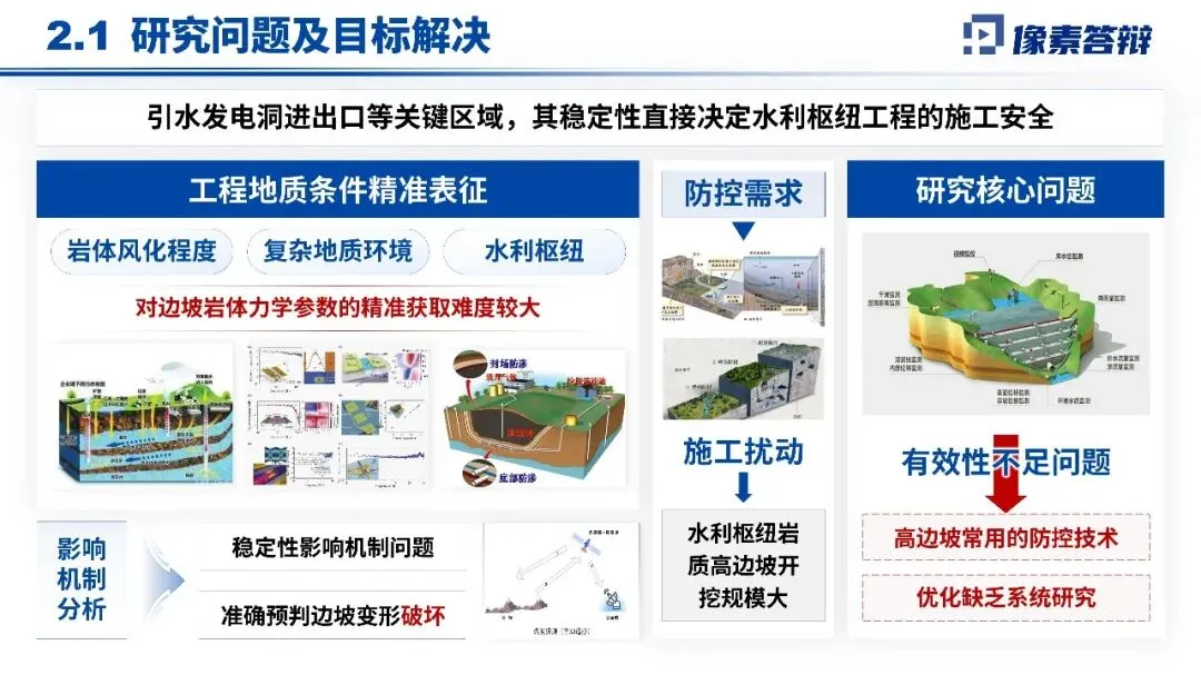 该PPT围绕水利工程深部碎裂岩体加固调控技术,申报国家科学技术进步奖。项目针对水利枢纽高边坡稳定问题,旨在通过加固调控与智能监测提升工程安全与寿命,支撑国家清洁能源建设与重大基础设施安全保障,但内容组织与深度有待进一步加强。该项目聚焦水利工程深部碎裂岩体加固调控技术研究,旨在申报国家科学技术进步奖。项目针对水利枢纽岩质高边坡在复杂地质条件下的稳定性问题,通过加固调控、智能监测与预警等技术手段,提升高边坡抗灾能力,保障水利工程安全运行,响应国家清洁能源发展与重大基础设施安全战略。PPT围绕“国家需求—工程问题—技术体系—应用价值”展开,但内容组织较为零散,存在信息重复与逻辑衔接不畅的问题。重点强调了边坡稳定性影响因素、监测技术局限、加固调控需求等,体现了问题导向,但缺乏清晰的技术路线图、课题分解与数据支撑,整体呈现偏描述性而非体系化。项目紧扣国家水利工程安全与能源战略,问题意识强,具有明确的工程应用价值。但在技术阐述上深度不足,缺乏创新点提炼、实验数据、典型案例及对比分析;结构松散,关键内容如技术方法、团队构成、成果量化等部分缺失,影响答辩的说服力与完整性。建议系统梳理内容逻辑,明确“问题—技术—验证—成果”主线;补充关键技术原理、实验数据、工程试点案例等实质支撑;突出创新性与可推广性,并结构化工期安排、团队贡献与风险控制。整体需强化体系性、实证性与表述严谨性,以匹配国家级科技奖项的申报要求。整套PPT共计 17 页,源文件均可编辑和修改PPT制作相关服务,请后台留言,或者扫码联系我们,微信:XSDB0521