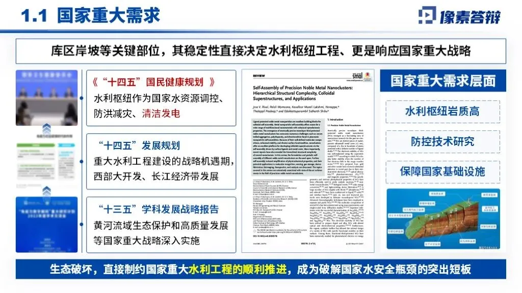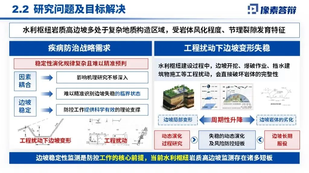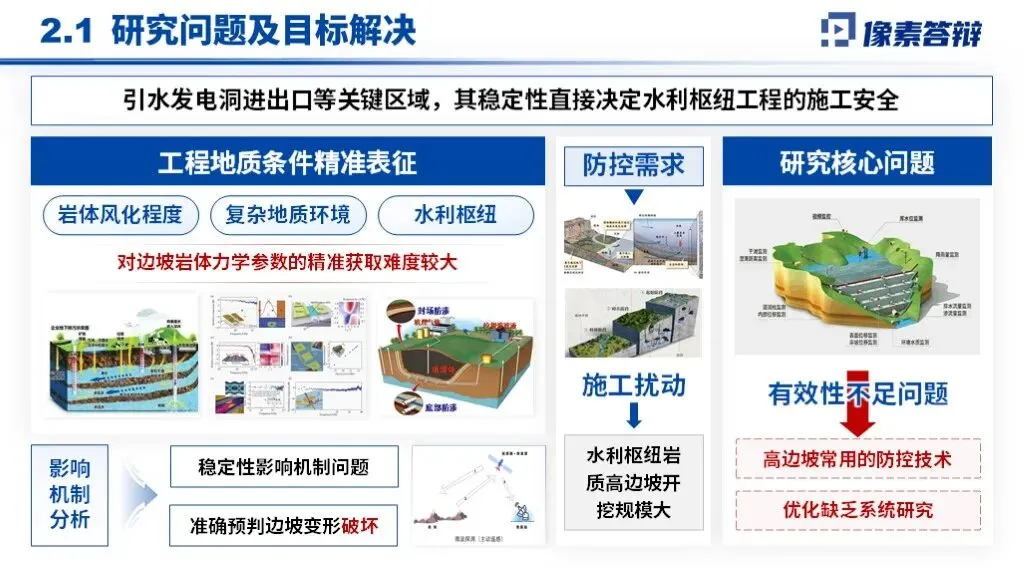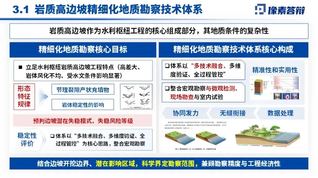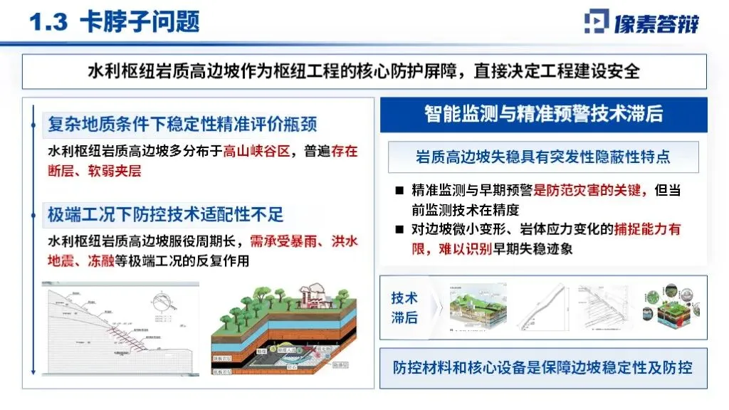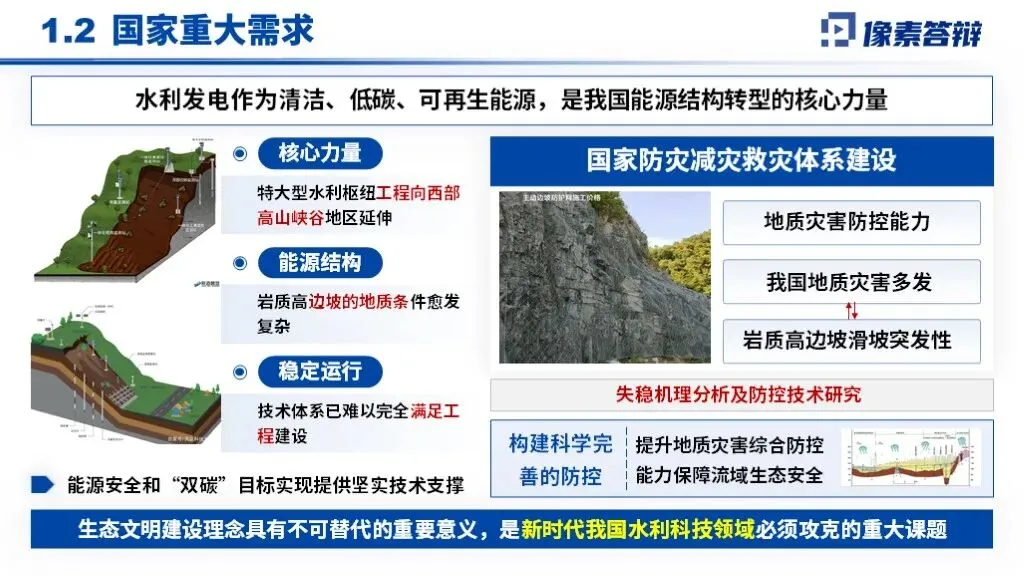PPT采用“战略背景-卡脖子问题-创新技术-效益验证”递进框架,以岩质高边坡稳定性调控为核心,贯穿地质勘察、智能监测、分级加固全技术链,形成从理论突破到重大工程应用的完整叙事体系。