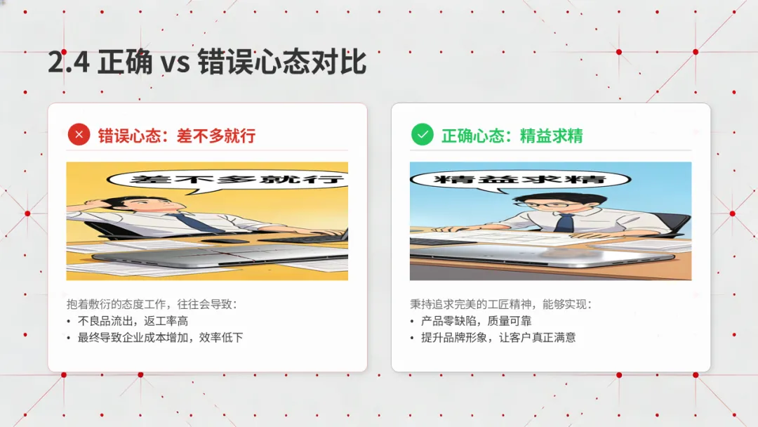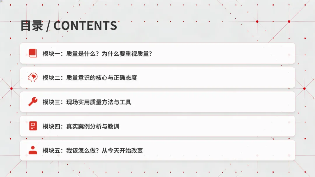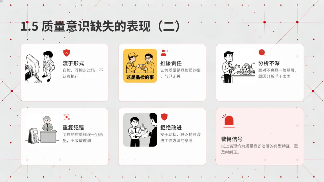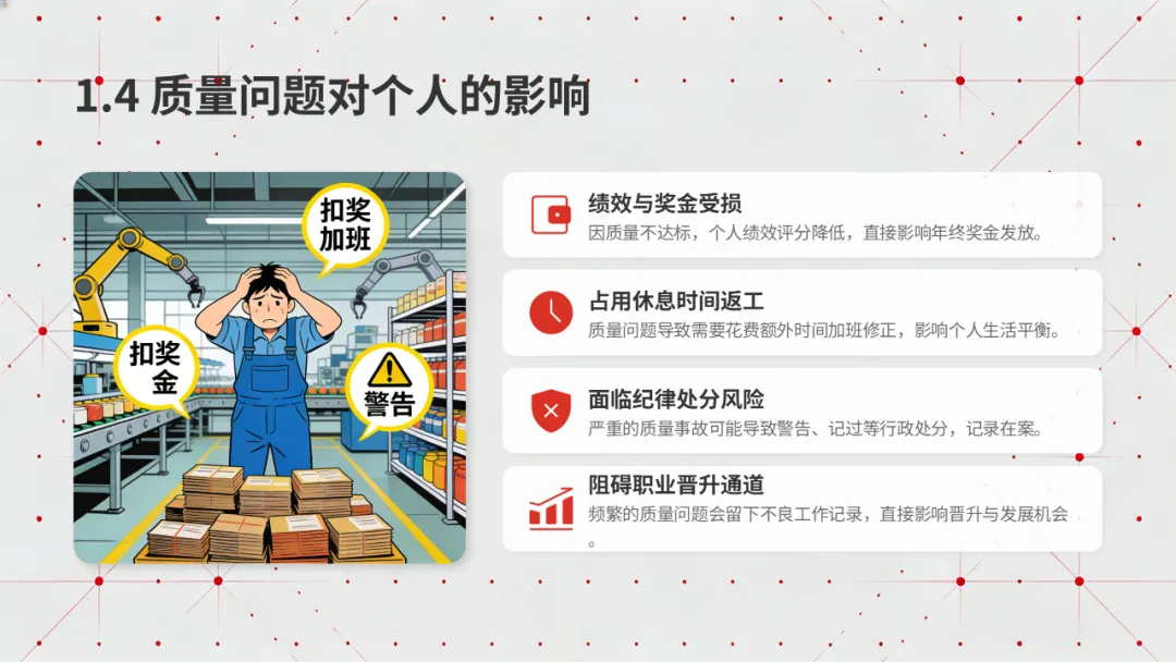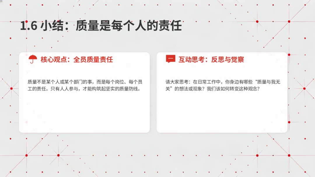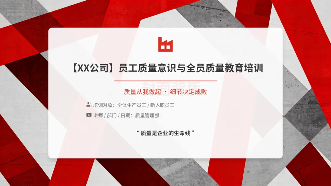 看清质量的本质(不只是标准,更是价值);看透质量问题的根源(不仅是手误,更是心障);看清做好质量的好处(不仅是公司要,更是自己赢);学会从“被动应付”到“主动守护”的转变方法这不只是一场培训,而是一次职业尊严的唤醒。