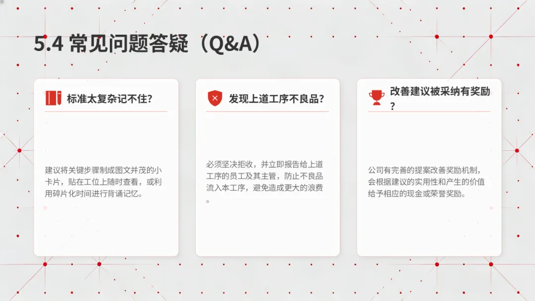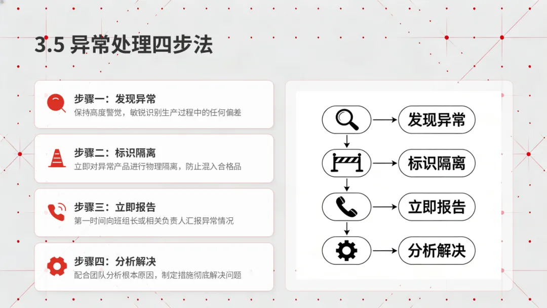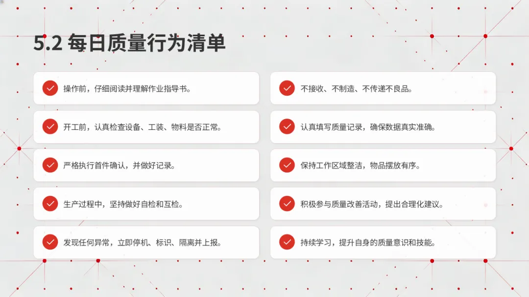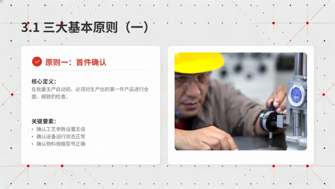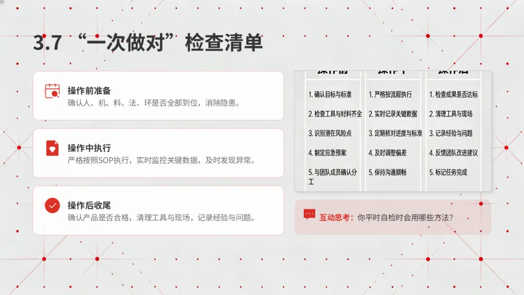 必须做的三件事(基于“过程所有者”理念):操作前:核物料、看SOP、点检设备、做首件(拍照留证);操作中:按标准作业、每小时自检、异常立即停;操作后:标识清楚、记录真实、清理5S