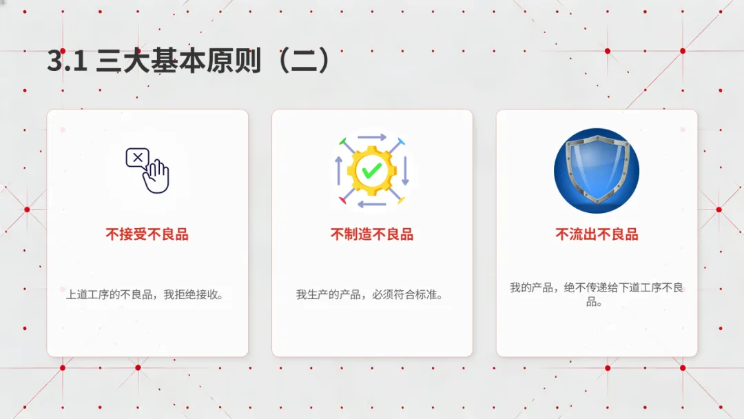 坚决不做的三件事(克劳士比“三不原则”):不接收上道不良品,不制造明知有问题的产品,不传递未确认状态的物料