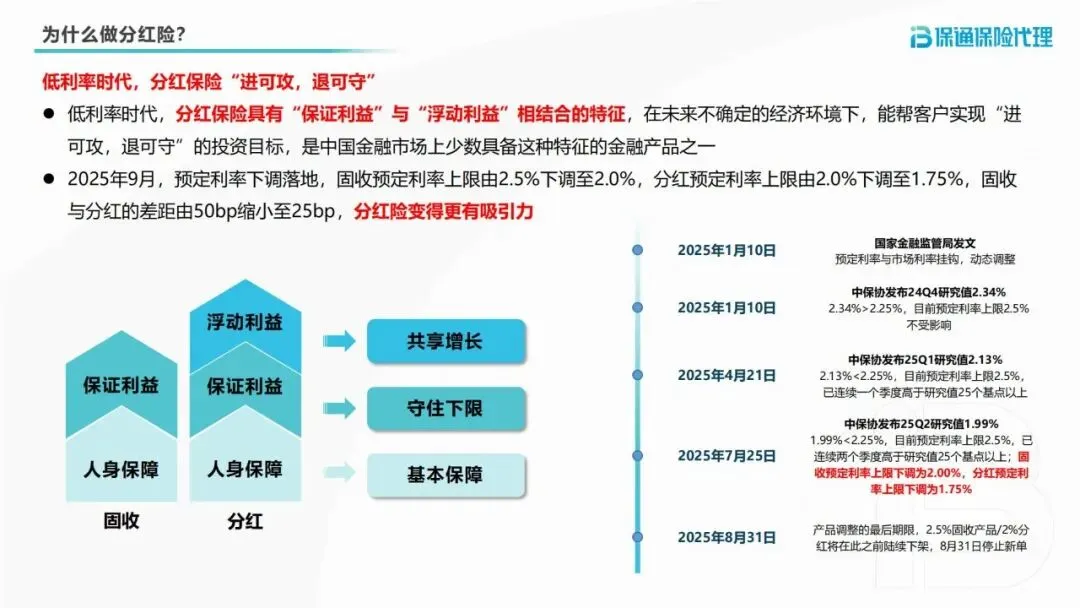 2025年9月,预定利率下调政策正式落地,固收预定利率上限从2.5%降至2.0%,分红预定利率上限从2.0%下调至1.75%。这一调整让分红险的优势愈发凸显,其“保证收益打底+浮动红利增值”的特性,成为对抗利率下行的关键武器。