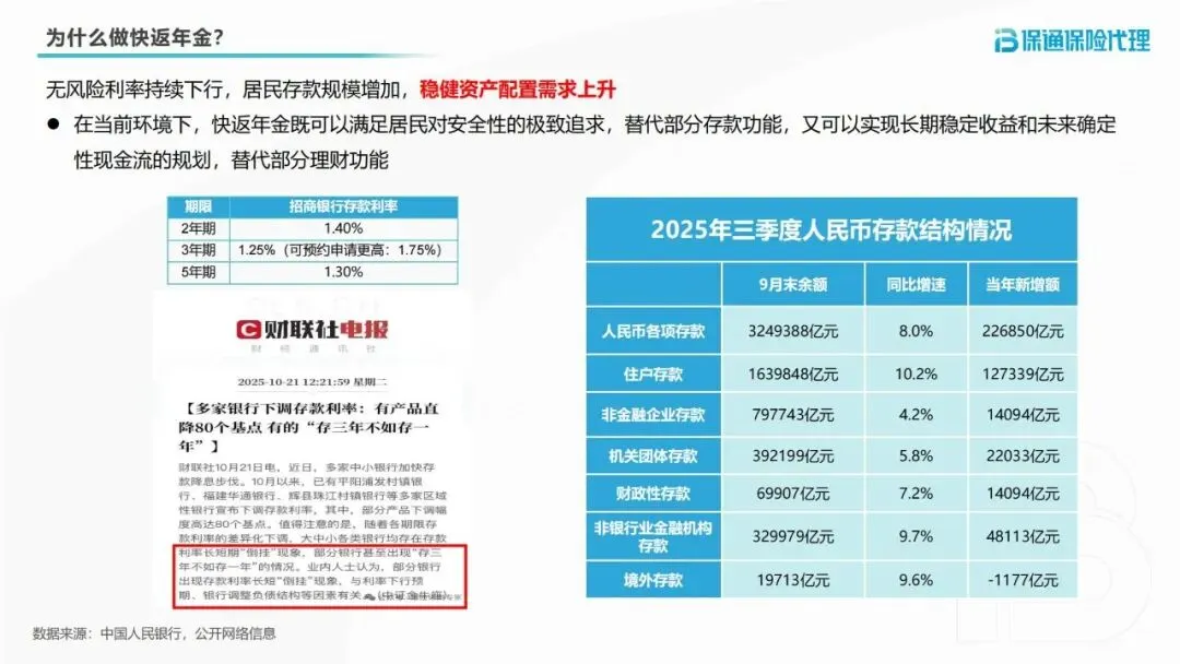 2025年三季度数据显示,人民币各项存款余额达324.94万亿元,同比增长8.0%,其中住户存款高达163.98万亿元,同比增速10.2%。这意味着越来越多的人渴望安全、稳定的资产配置渠道,而快返年金险既能替代部分存款功能,又能实现长期现金流规划,完美契合市场需求。